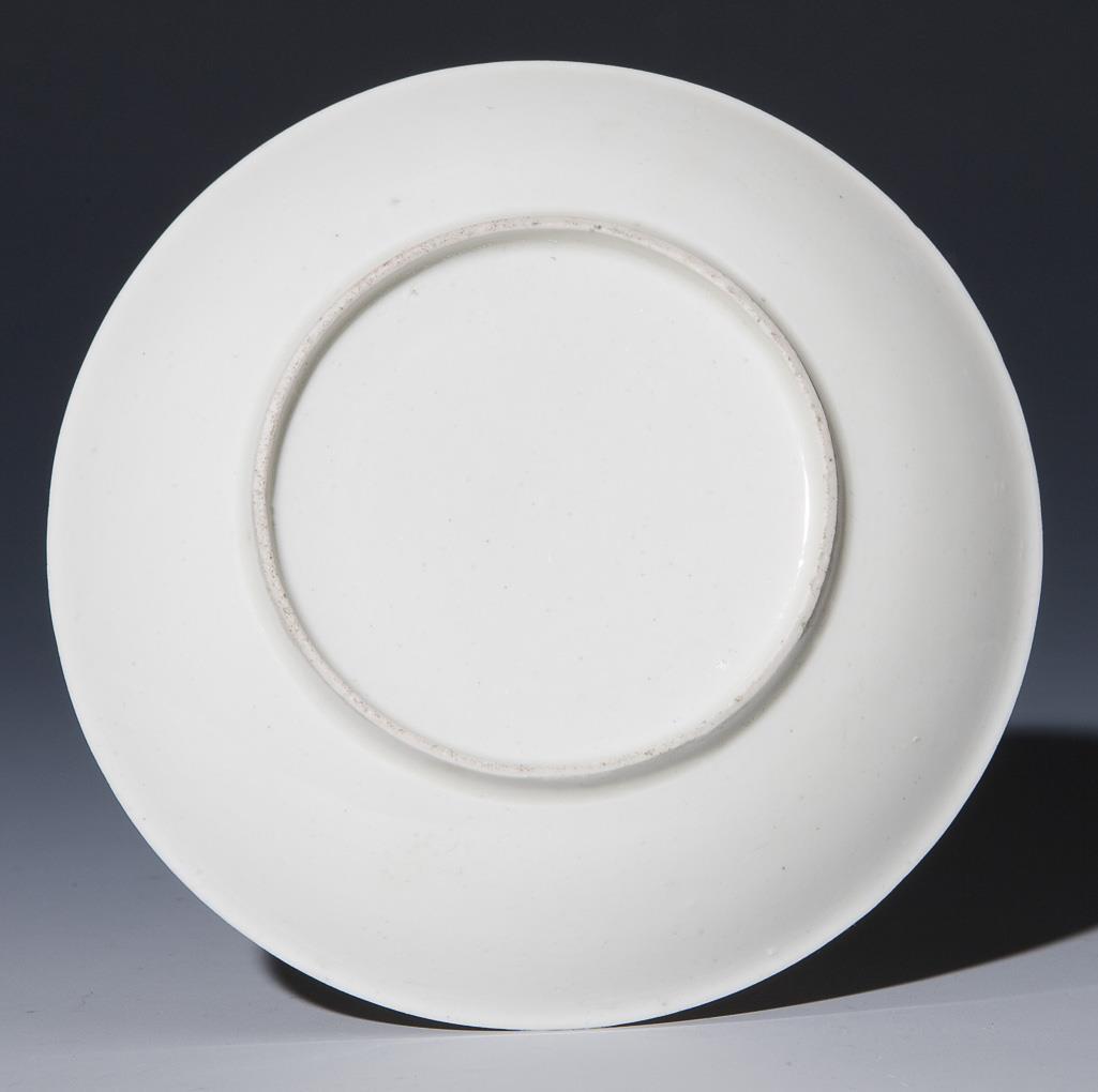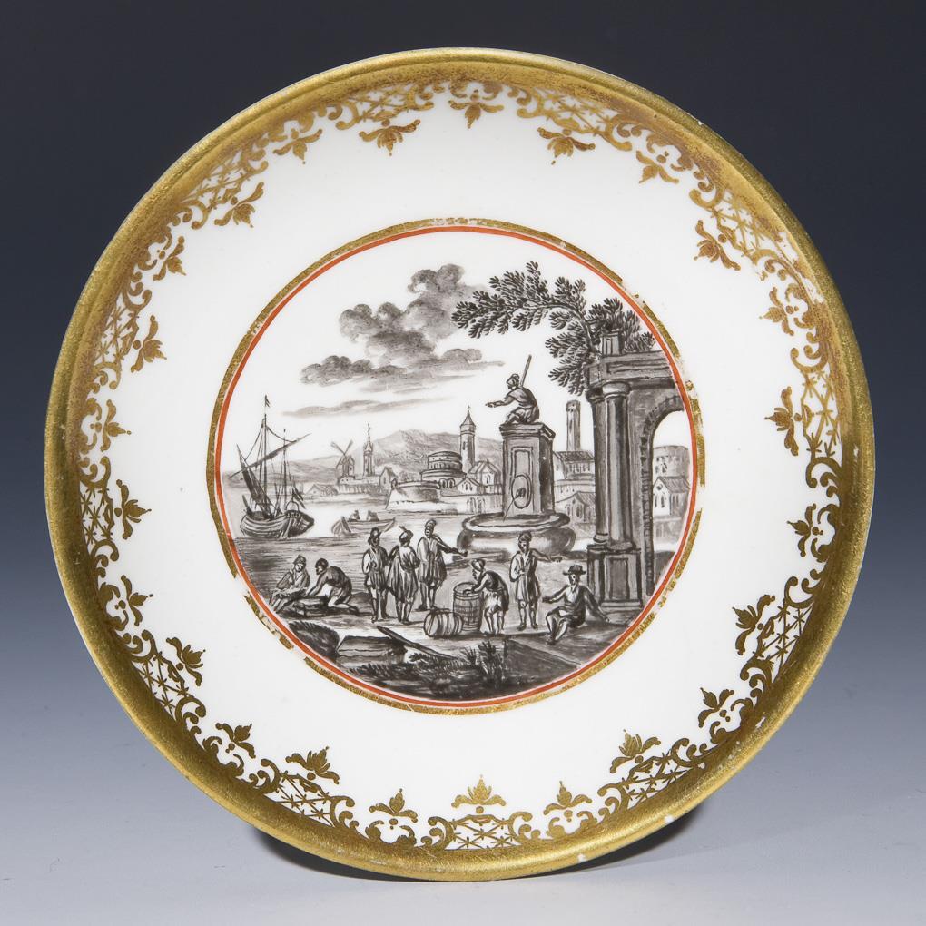 Meissen or Du Paquier 1720-1725 body. Fine black-lot painting circa 1740. Coral-red-gold contoured circular reserve with merchant ice scene in the mirror. Gold lace border. Without mark. Gold rim partially rubbed.