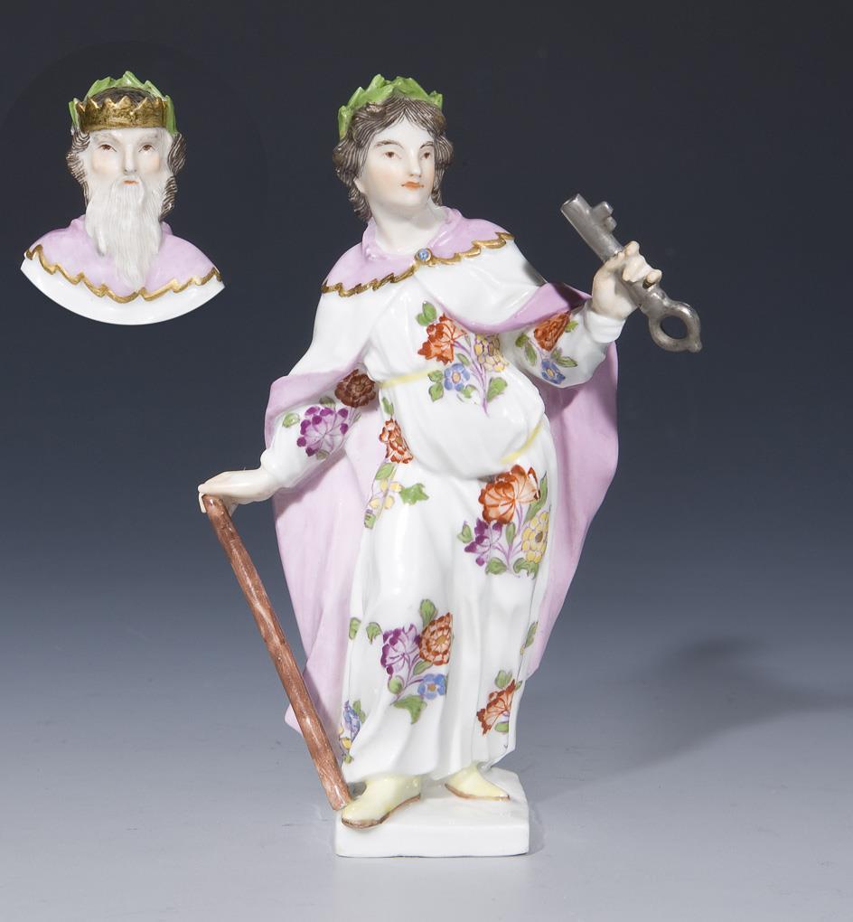 Model by Johann Joachim Kaendler and co-workers 1747. Colourfully painted, gold painted. Unglazed base, sword mark. Hands, laurel, key restored.