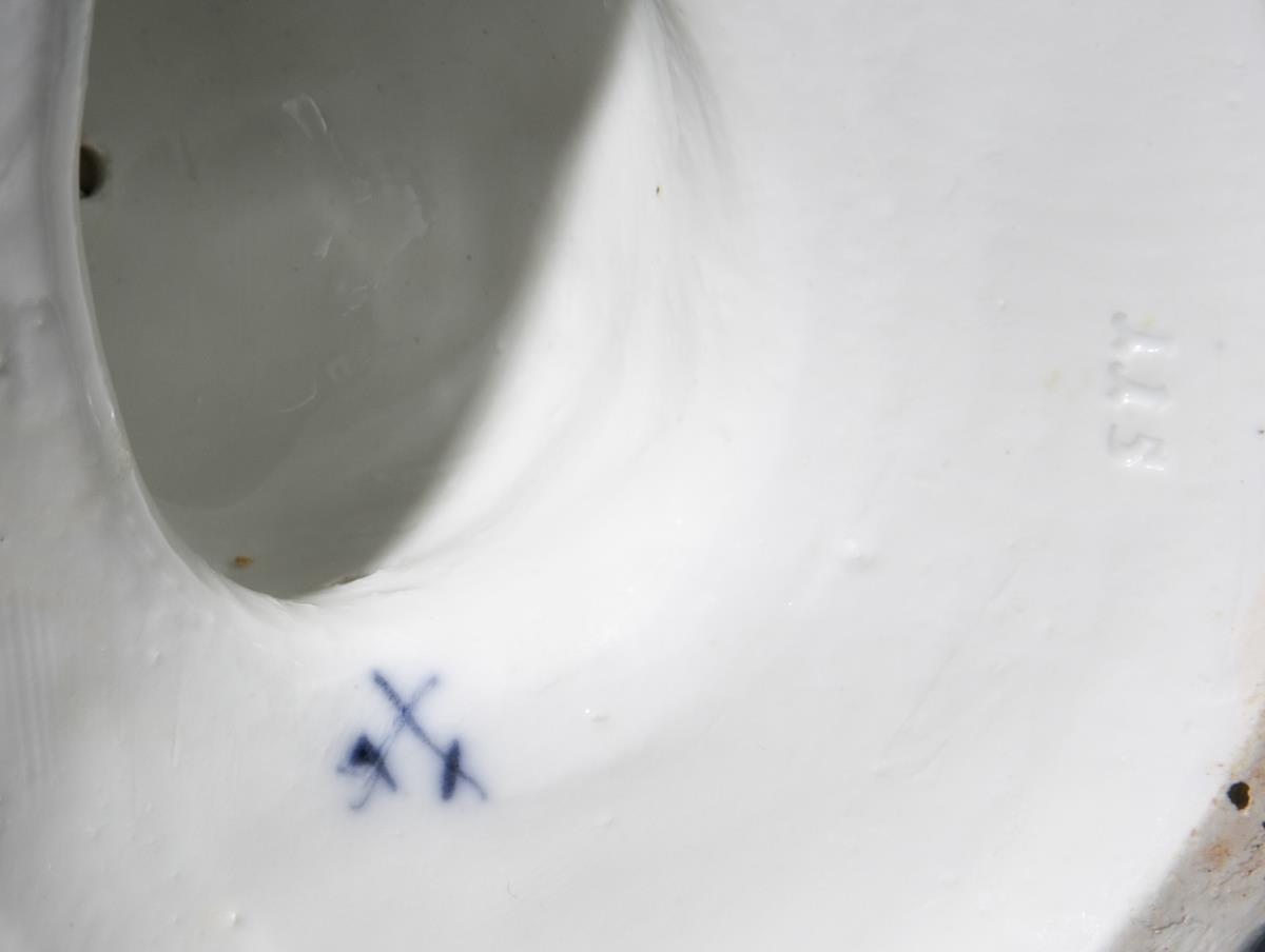 Model by Johann Joachim Kaendler and associates 1753. Colorfully painted, gold painted. Press mark, sword mark. Cross through Hercules hairline crack, tail, one toe restored, foliate, base edge front, one fur tip rear bumped, small burn crack rear of base.