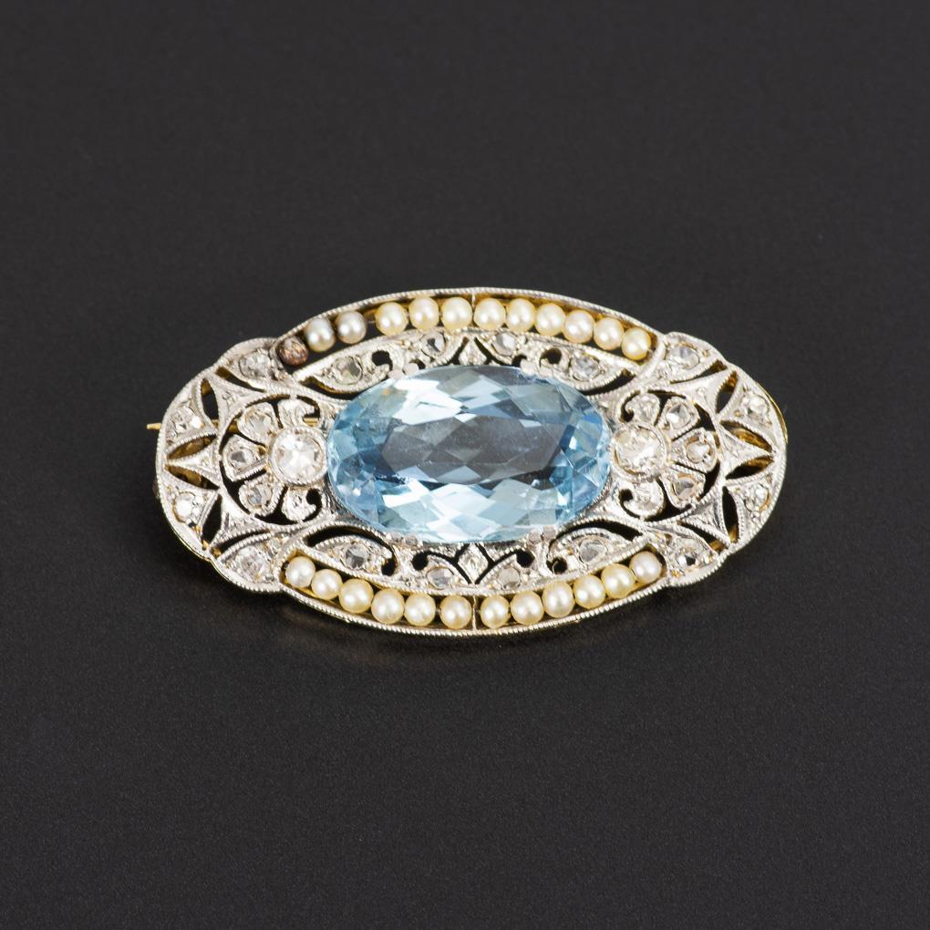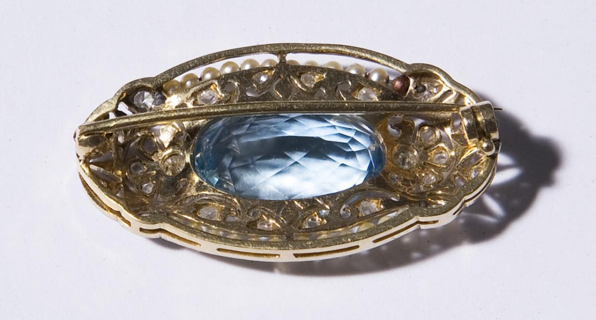 Ornamental openwork. 1 faceted aquamarine, 2 small diamonds, numerous diamond roses, river pearls. Brooch and eyelet bent.