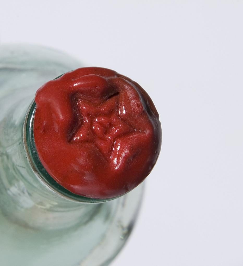 A set of 6 brandy tumblers, frontal the Trinity Tower from the Moscow Kremlin. 1 sealed period vodka bottle. 1 figure bottle stopper, pewter, colorfully painted. Josef Stalin, 1878-1953, communist politician of Georgian origin, 1927-1953 dictator of the Soviet Union.