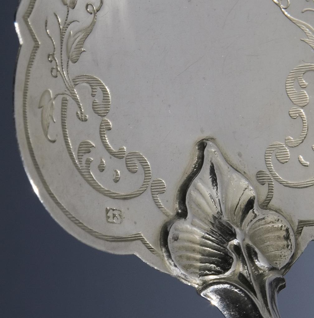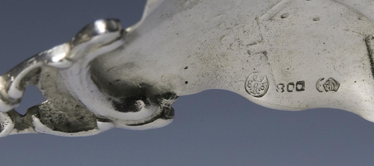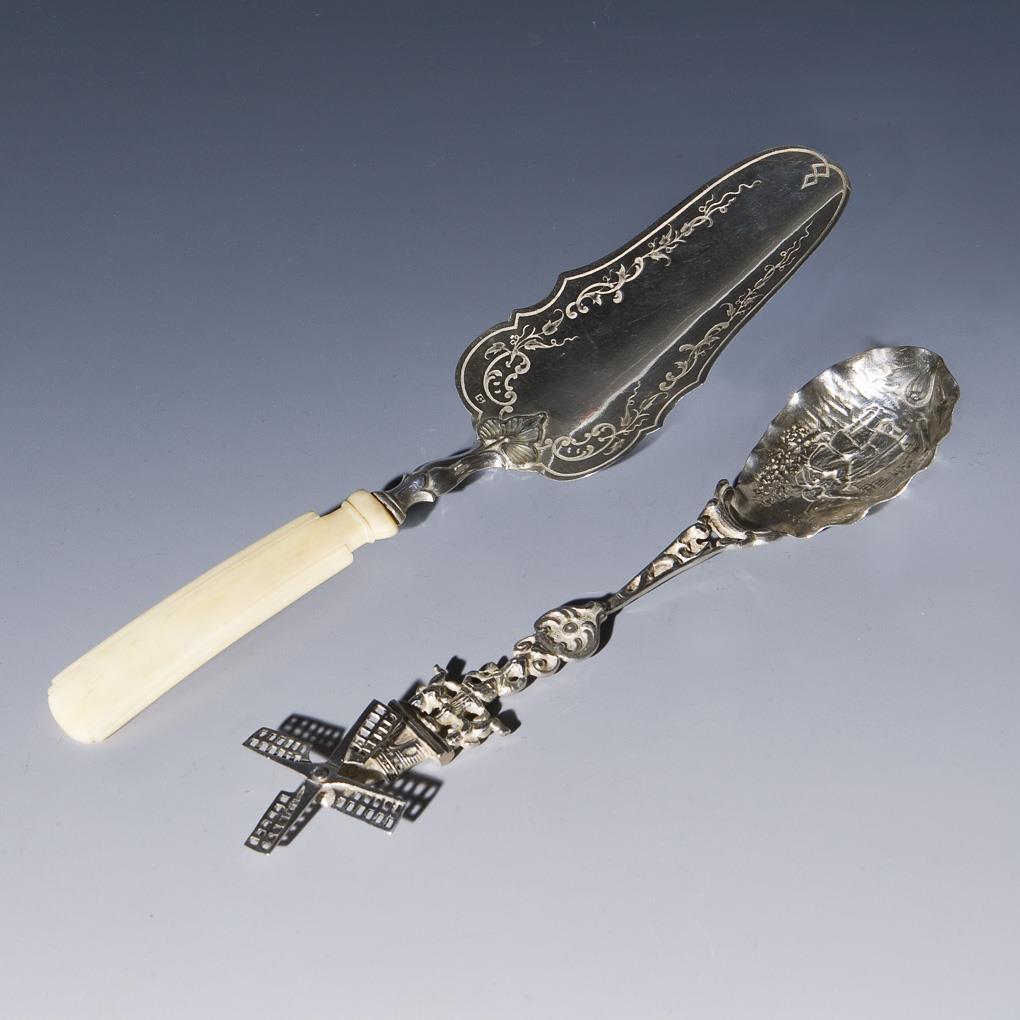 Lifter: 13-lug silver, front engraved, ivory handle. Hallmark: fineness. Spoon: 800 silver, relief engraved and cast. At the handle end windmill with movable wings. Hallmarks: Crescent/Crown, fineness, factory mark.