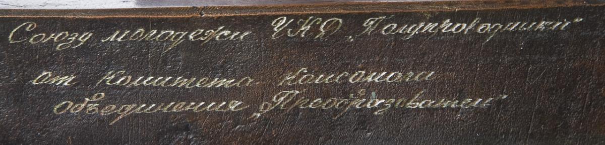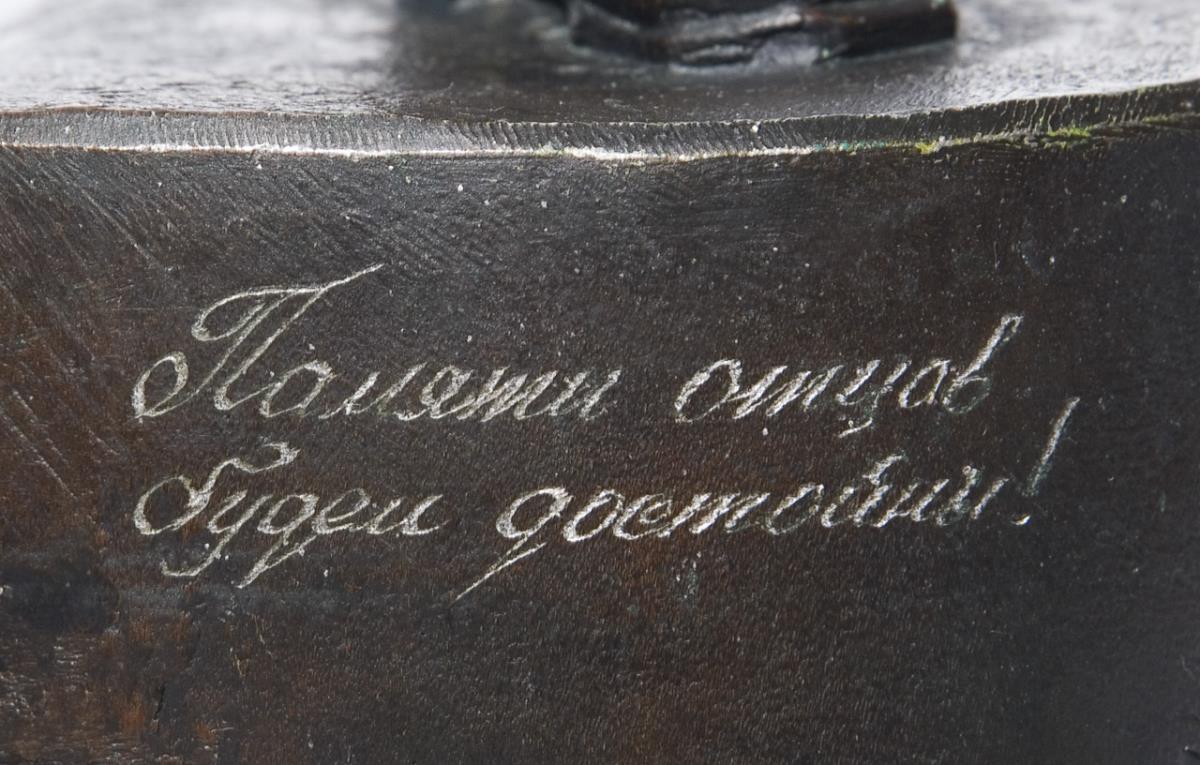 Standing figure with pistol and field glasses in lunge. Cyrillic dedication.