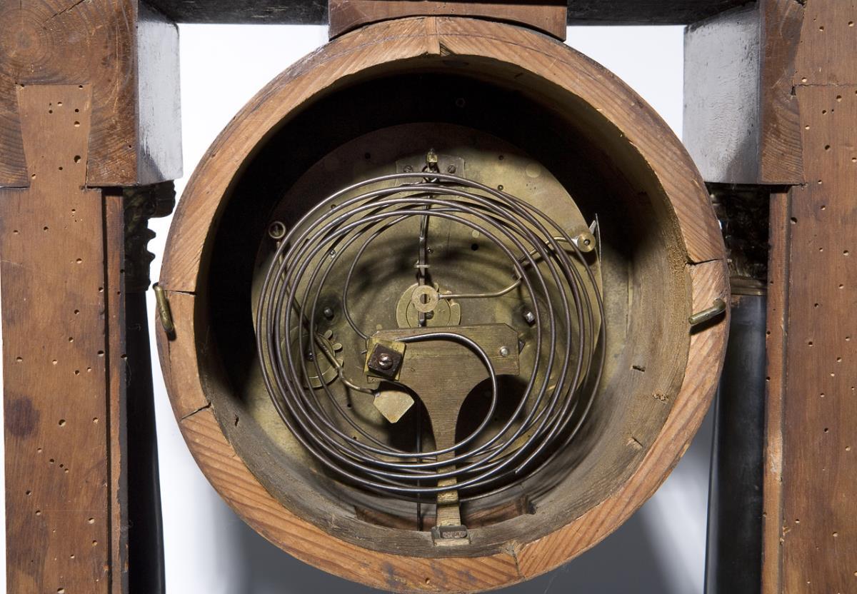 Chiming mechanism on two clay springs. Pendulum on thread suspension. Small roller chime movement built into the base. Key winding. White enamel dial, black Roman and Arabic numerals.