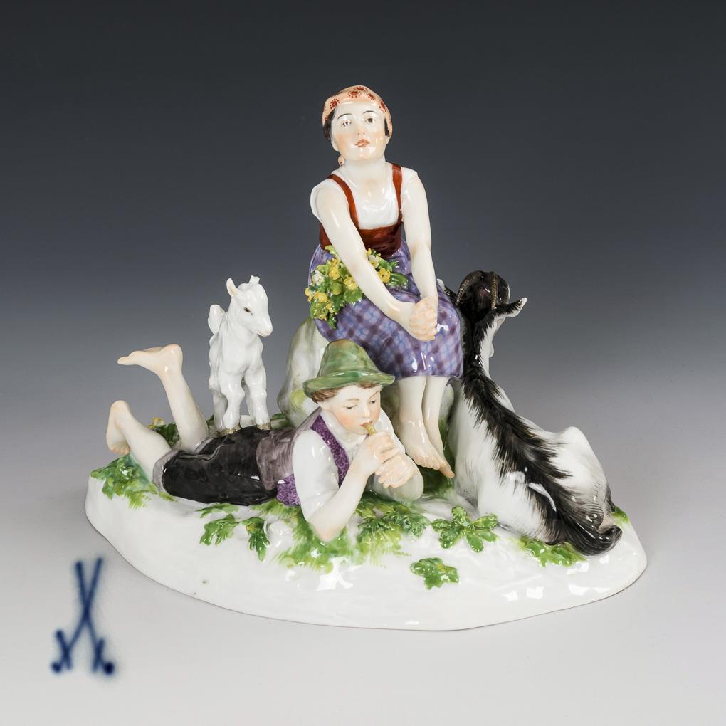 Couple of children as goatherds with goat and kid.
