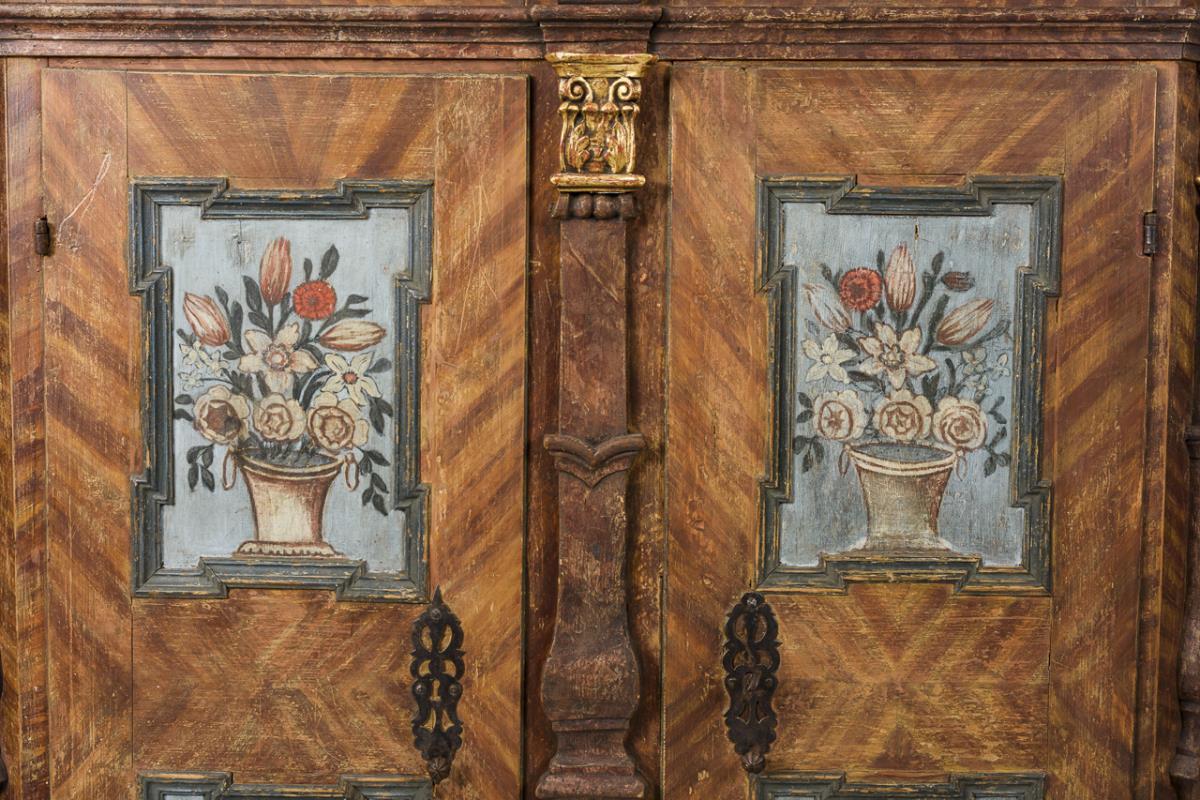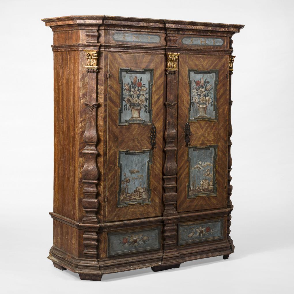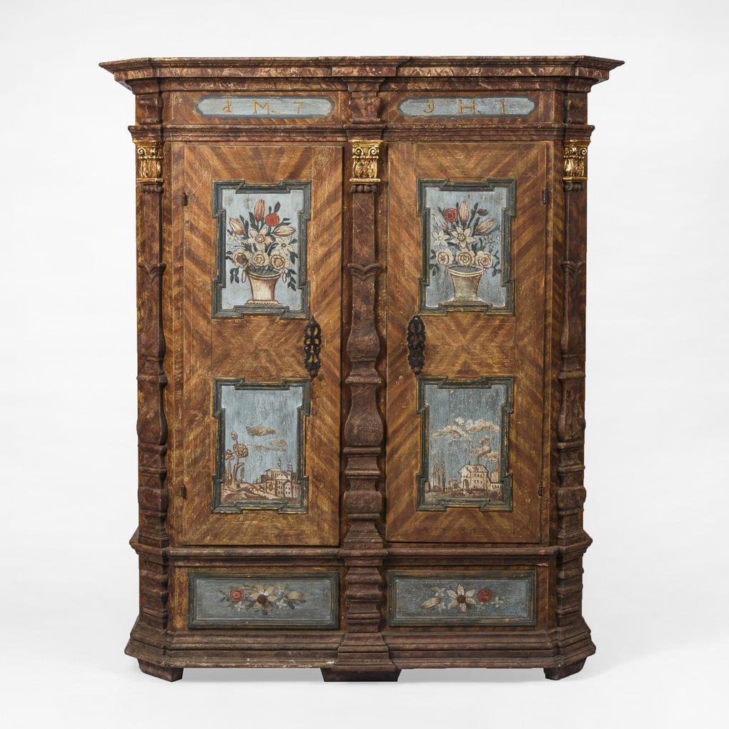 2-türige Bauernschrank in Brettbauweise with stepptem Gesims, Eckschrägen and Baluster pilasters with gold gefassten Kapitellen, 2 Sockelschüben and floral embossed Schlüsselbeschl;gen, 2 Rosettenknäufe. Decor of polychrome floral and architectural painting, dated "1791", monogrammed "MH". Inside 2-piece and brown frame: 1 side with clothes rail, 1 side with ledges for shelves, 1 side lockable by wooden wedge. Signs of age/use, frame rubbed, wood with small defects.