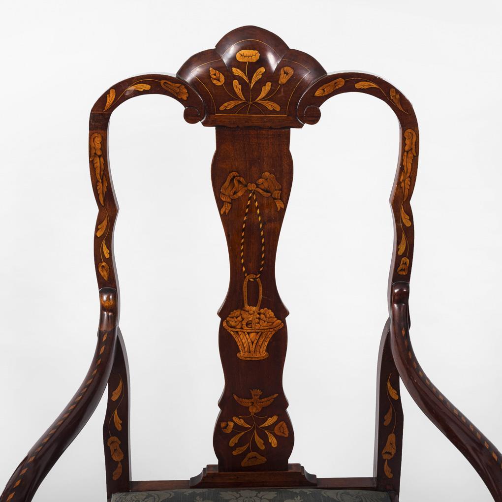 4 upholstered armchairs with center board in style-typical curved form with bow and flower marquetry in Dutch marquetry style, upholstery with blue, floral patterned cover. Some signs of age/use, upholstery and cover old supplemented and with defects.