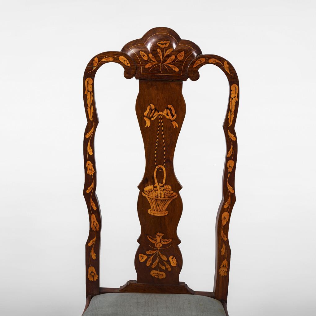 4 upholstered armchairs with center board in style-typical curved form with bow and flower marquetry in Dutch marquetry style, upholstery with blue, partly floral patterned cover. Some signs of age/use, upholstery and cover supplemented and with defects.