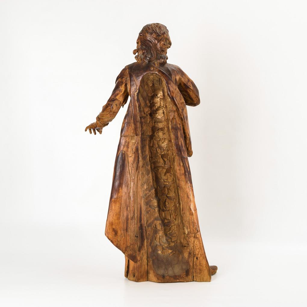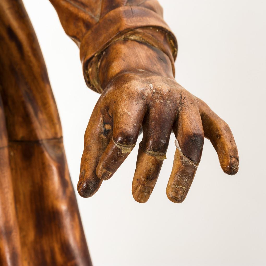 Standing figure placing his right hand expressively on his heart. In his left he possibly held an attribute. Qualityfully stretched dry cracks, 2 fingers supplemented, 1 glued, minor dry cracks.