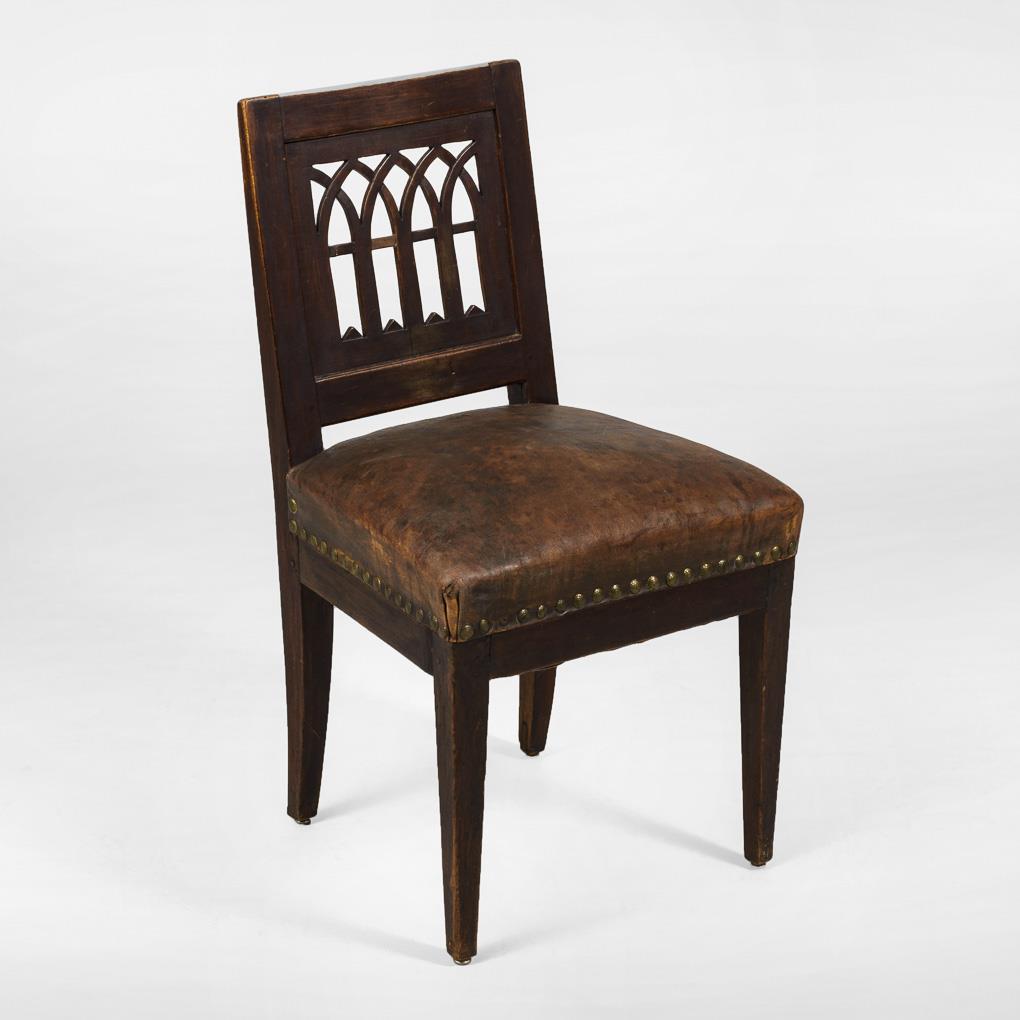 Reclining chair with Gothicized pointed arches in the backrest, on 4 pillar legs. Recent upholstery with brown leather cover and decorative nailing. Old restored, signs of age/use.