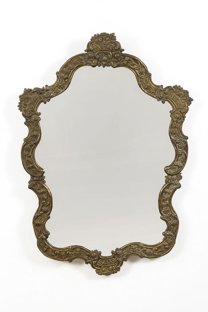 Curved wall mirror in baroque design language with embossed rocaille and floral decoration. Wooden frame with breakage, mirror glass with smaller spots.