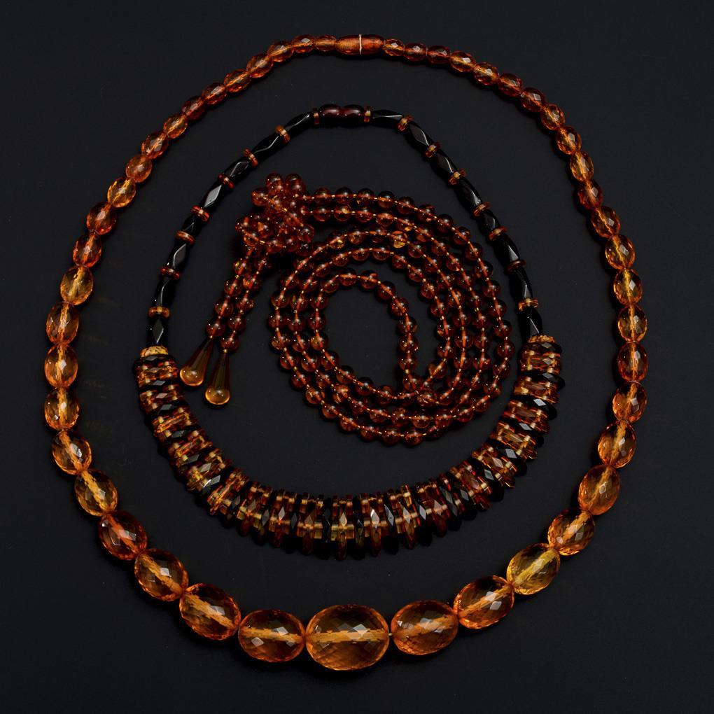 Lace chains with various amber segments, spheres and faceted olives in the course.