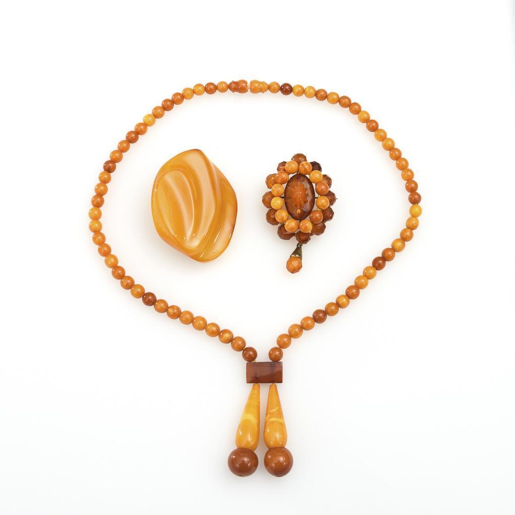 Short lace necklace, brooch and pendant/brooch with different colored amber stones. Screw clasp. Metal brooches. Small eyelet.