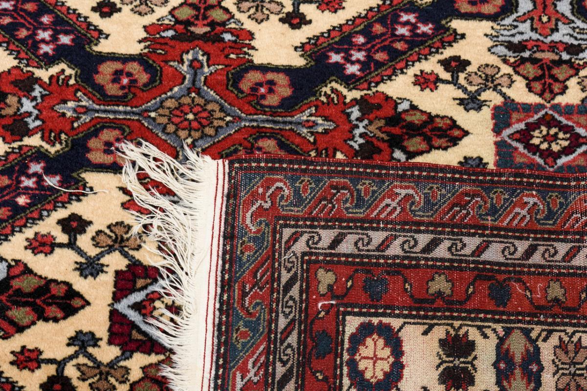 Wool, hand-knotted. Polychrome decoration with predominantly red, blue and ivory. Approx. 231 x 356 cm.