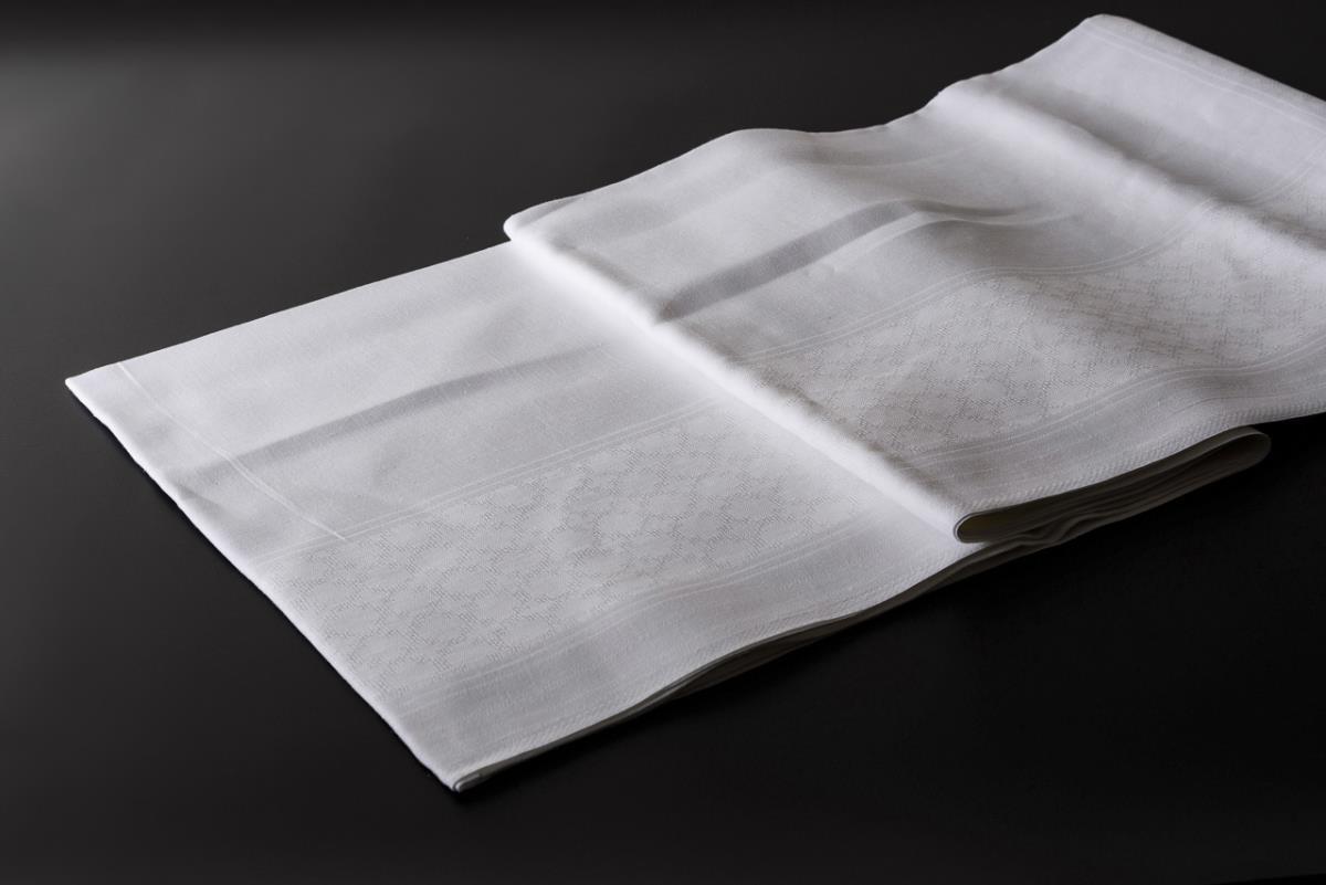 Fine cloth with woven breakthrough pattern, in the center as a rectangular frame, on the edge as wide borders. Mongram GL with baronial crown.