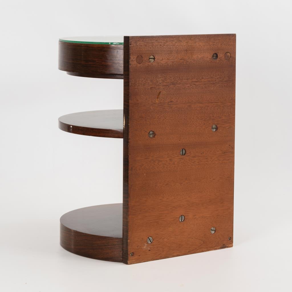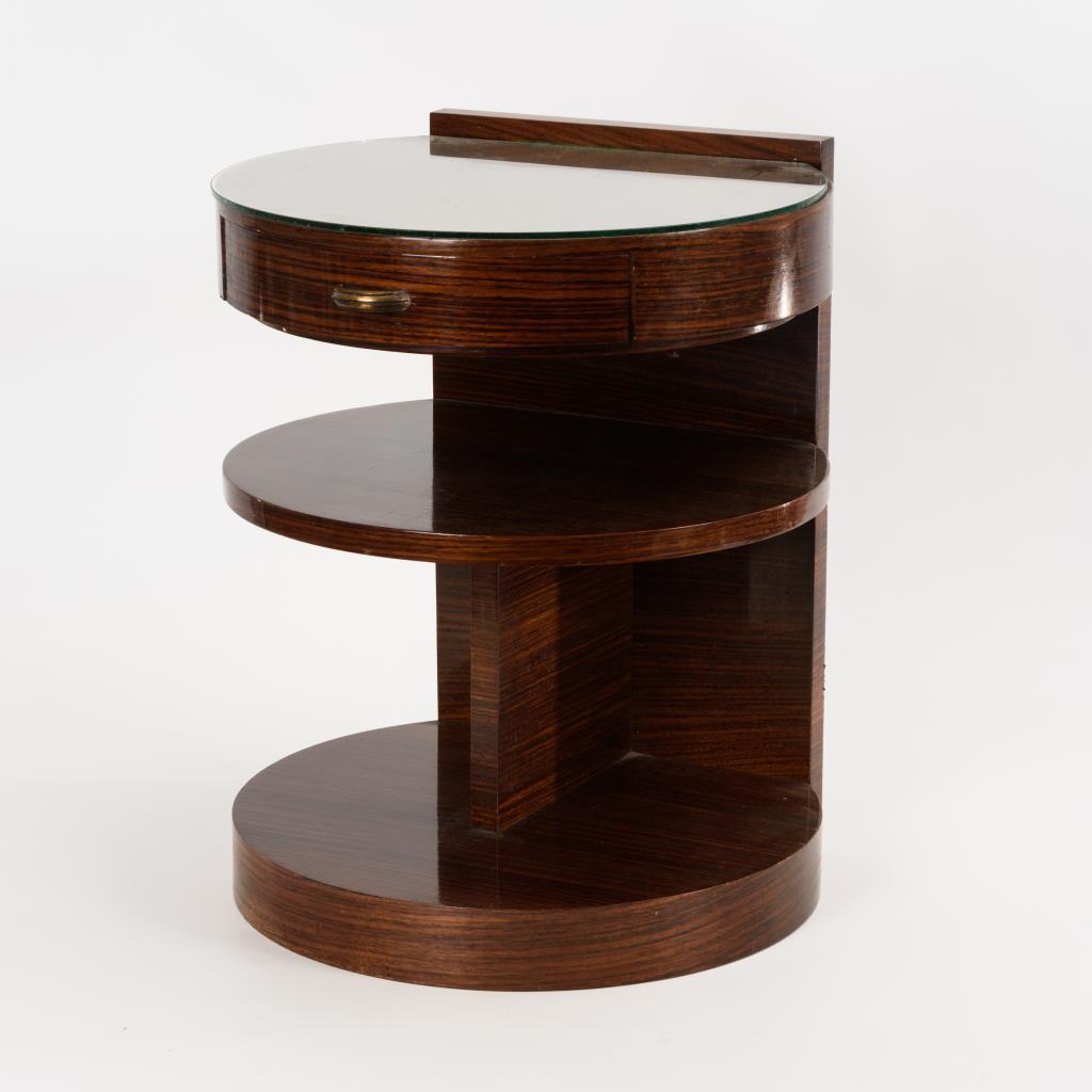 Halbrunder, tonnenförmiger Beistelltisch mit Zargenschub und offenen Ablageflächen. Minimale Alters-/Gebrauchsspuren.