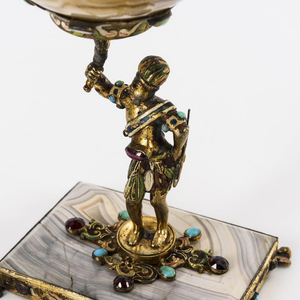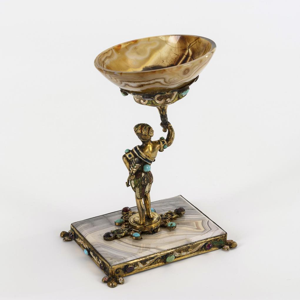 Inspired by the "Viennese enamel" designed stone-cut bowl with Indian figure as carrier. Broken solder trace on the bowl holder, missing appliqué of the sash, agates partly hair-cracked, more rubbed.
