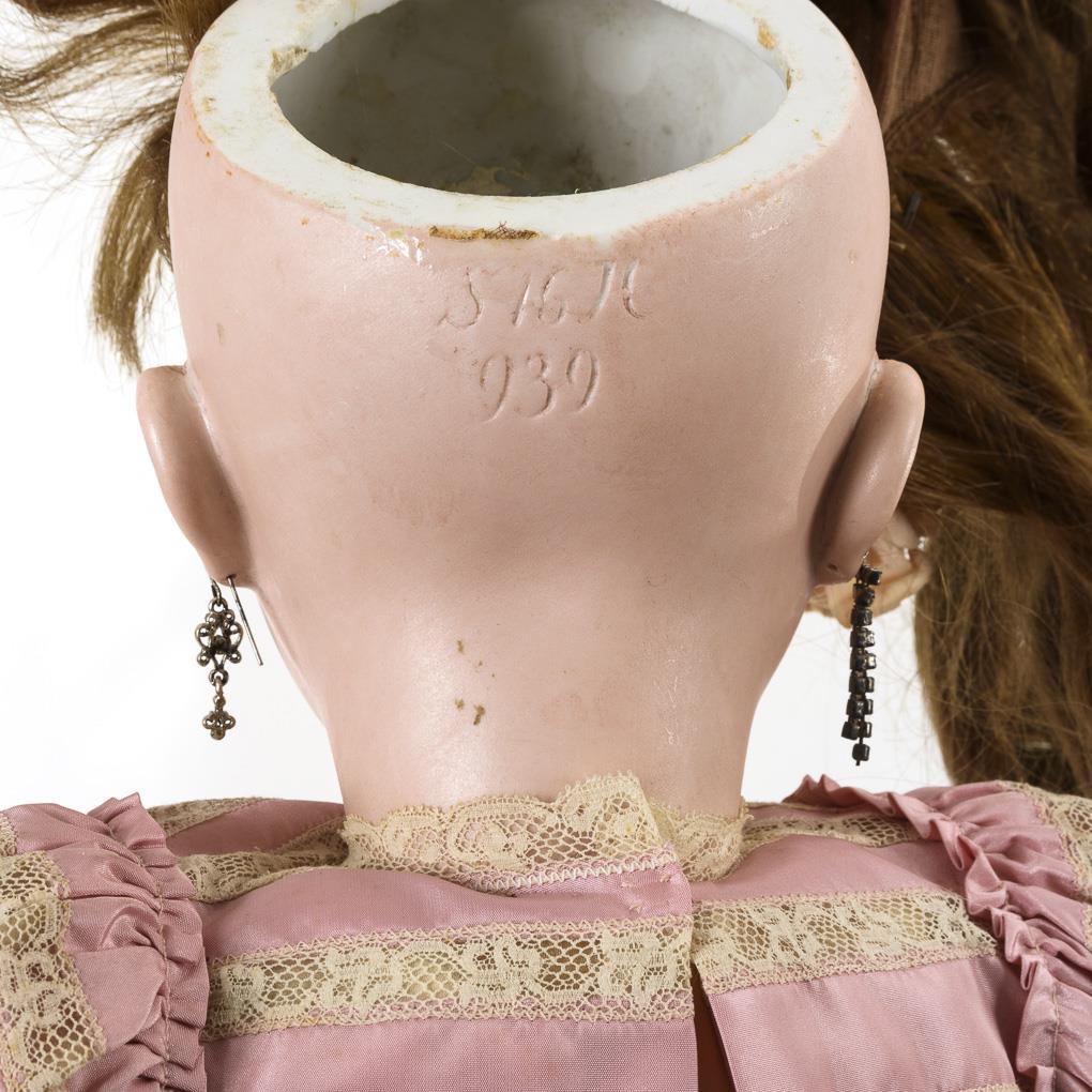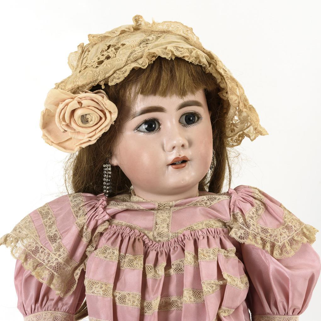 Crank head, fixed blue eyes, eyelash remnants, earrings, long human hair wig. 15-piece articulated body. Dress with puffed sleeves and lace, white bonnet, black and white shoes. Head x-rayed: without defects, only small repair at the left eye rim and burn cracks behind the ears. Body with overpaintings, 1 finger broken.