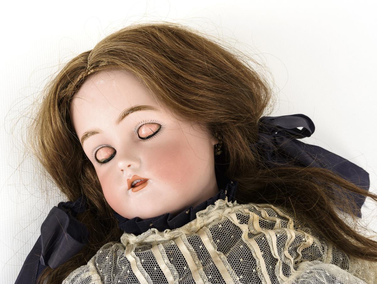 Crank head, blue sleeping eyes, earrings, dark blonde human hair wig. 13-piece limb body. White tulle apron over dark blue dress, white oilcloth shoes. Small chip on right eye, neck restored. Body with paint defects and overpaint.