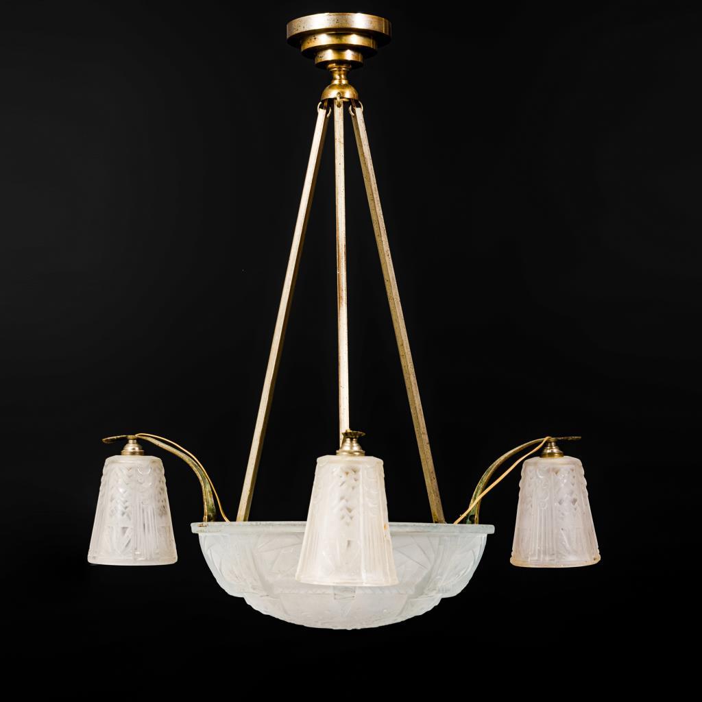Deckenlampe mit 3 Steben und Schale mit 3 gebogenen Armen und Glasschirmen. Alters-/Gebrauchsspuren.