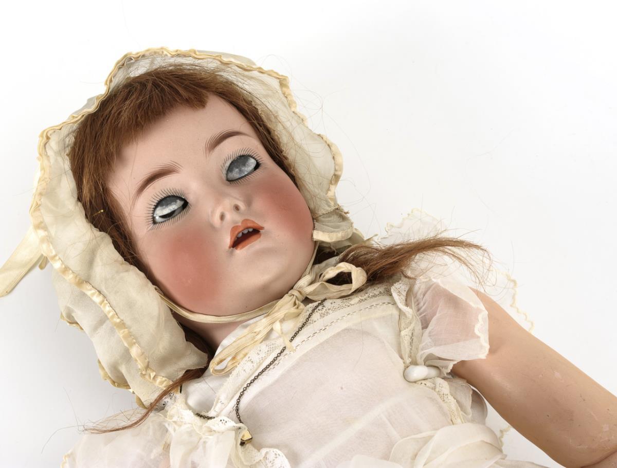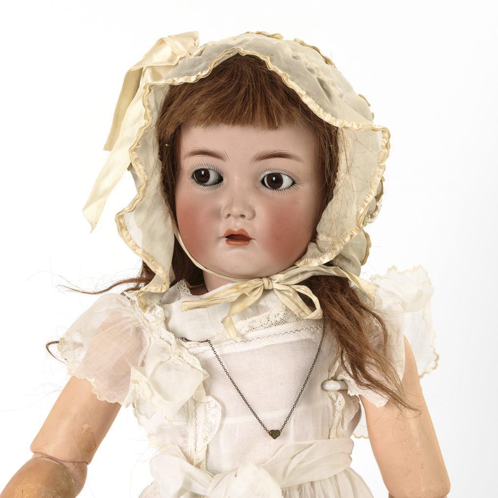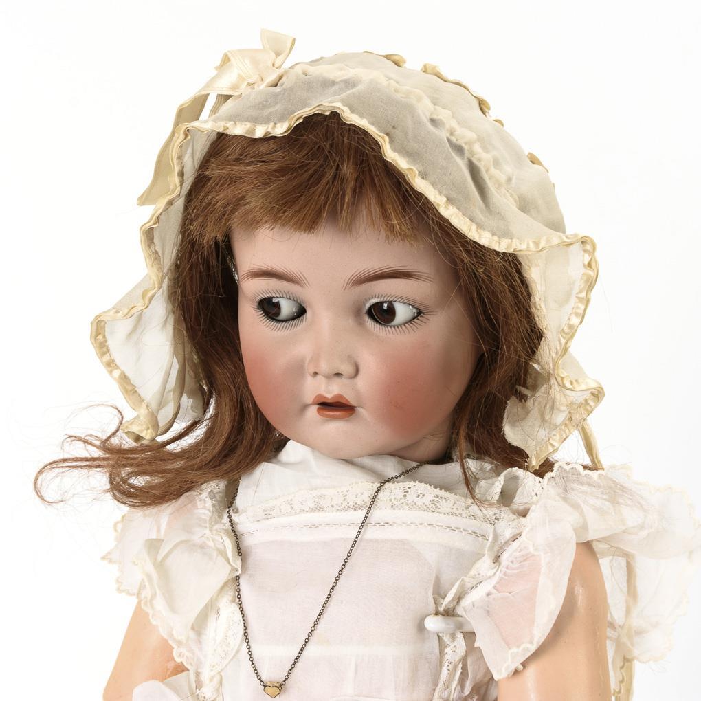 Crank head, brown sleeping/shelmet eyes, auburn human hair wig. 19-piece limb body (in Toddler style). Old white dress of delicate fabric, white bonnet, re-sewn black leather boots. Restored defect at back of head. Body partially painted over, eyelids unpainted.