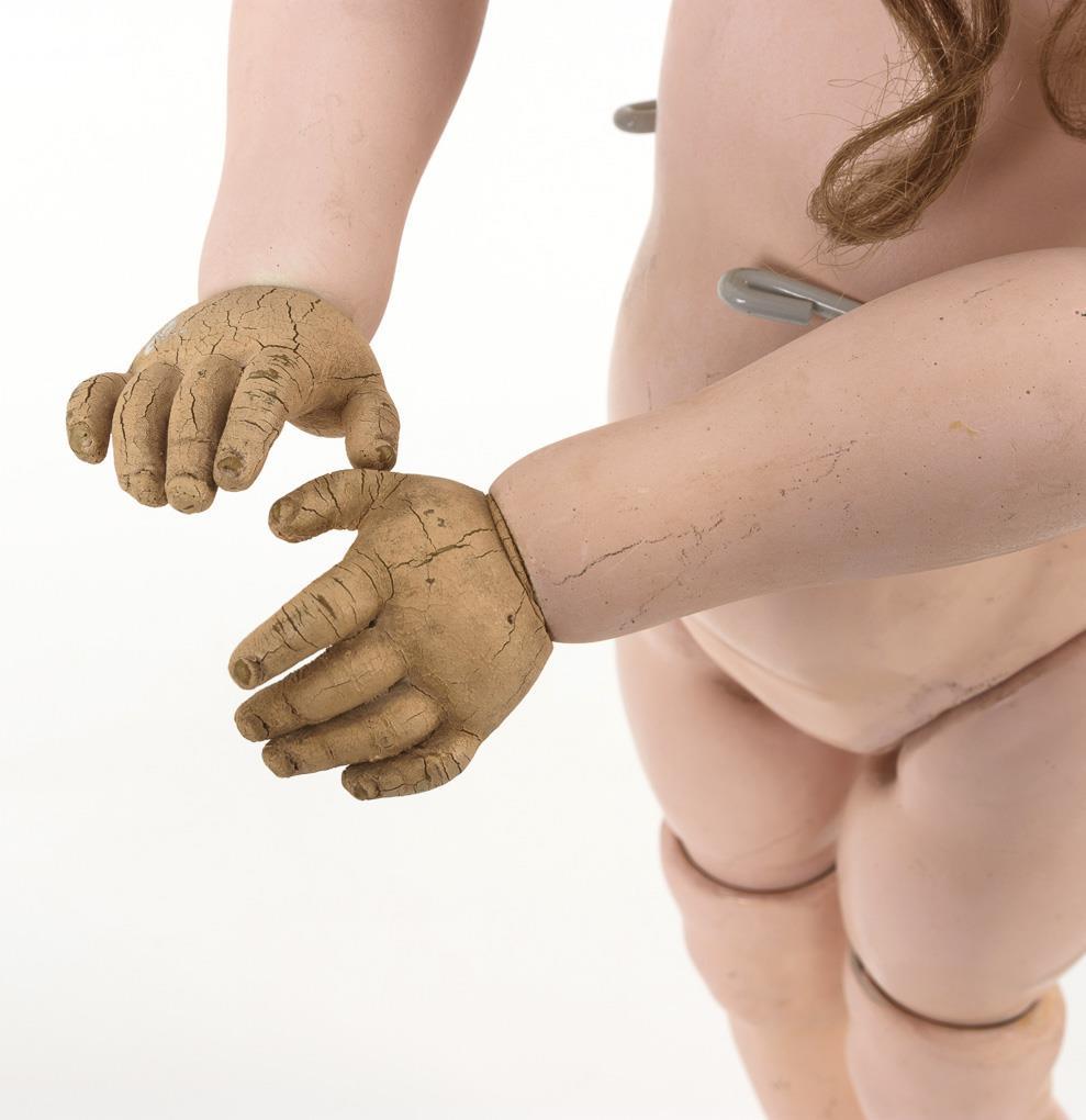 Crank head, blue sleep/shelf eyes, eyelash remnants, younger complemented medium blonde curly wig. Beautiful 19-piece toddler body with long lower legs. Red and white striped dress with white apron. Head x-rayed: with no defects. Original rubber hands cracked due to age.