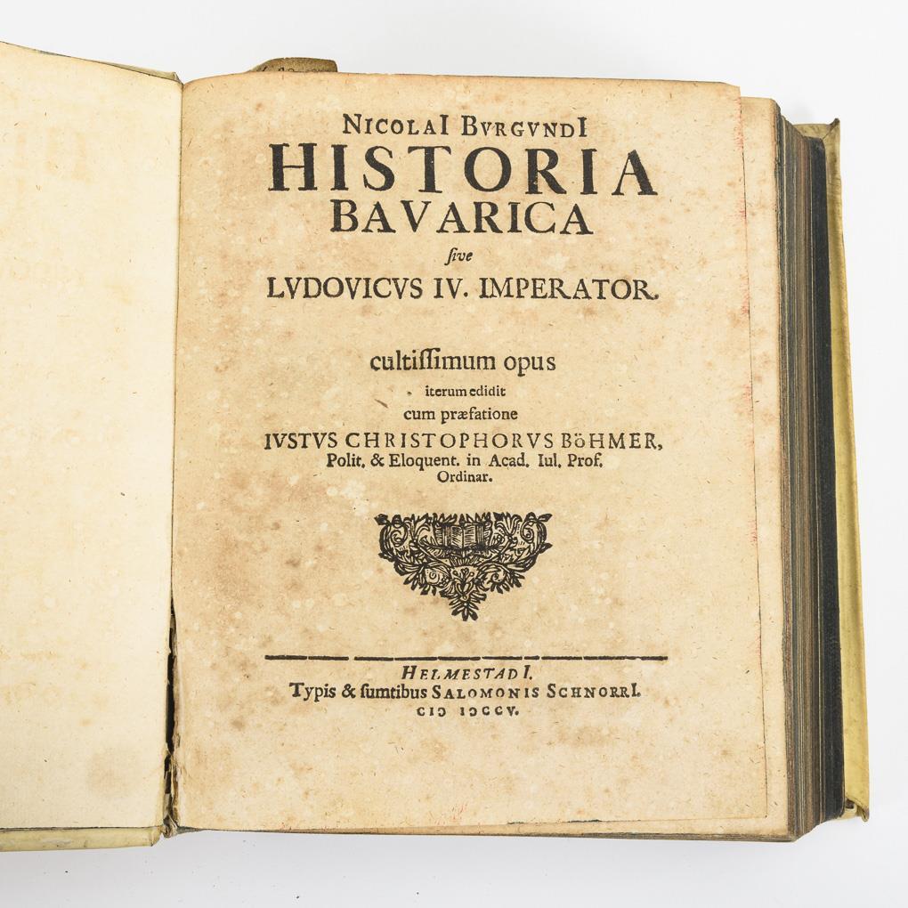 Nicolai BURGUNDI: "Historia Bavarica sive Ludovicus IV. Imperator", "cultissimum opus iterum praefatione Justus Christophorus Böhmer", Typis & sumtibus Salomonis Schnorri, Helmestadi (Helmstedt) 1705. Titelblatt, (6), 180 Seiten. / Danielis PAREI: "Bavarico-Palatina." "Georgius Christianus Joannis recognouit ...", Sumtu Friderici Wilhelmi Foersteri, Francfurti ad Moenum 1742. 148, (12), 624, (41) Seiten. Im Pergamenteinband mit goldgeprägtem Lederrücken, Blauschnitt. 21 x 17 cm