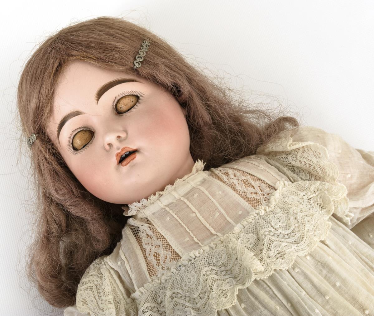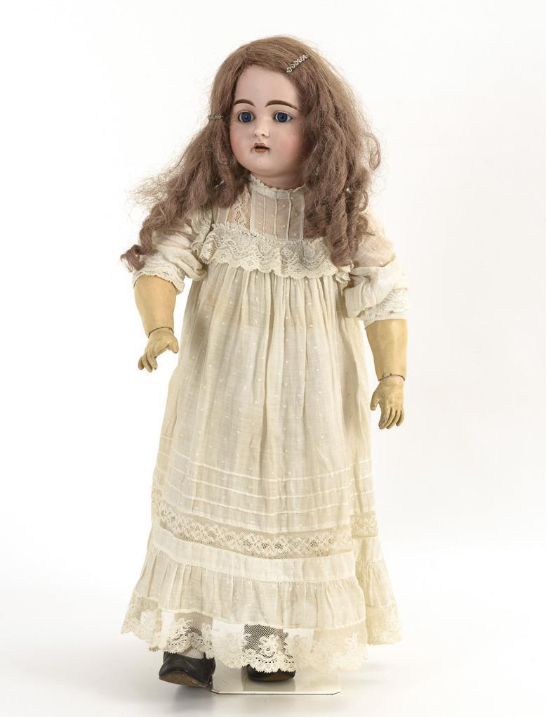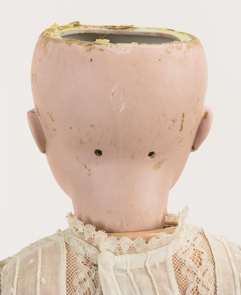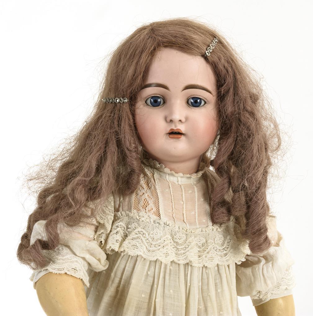 Crank head, blue sleeping eyes, pierced ears, long reddish-blonde curly wig. 17-piece limb body. White dress, black children's shoes. Head x-rayed: without defects, only minimal bump on left ear hole. Body with overpaintings.