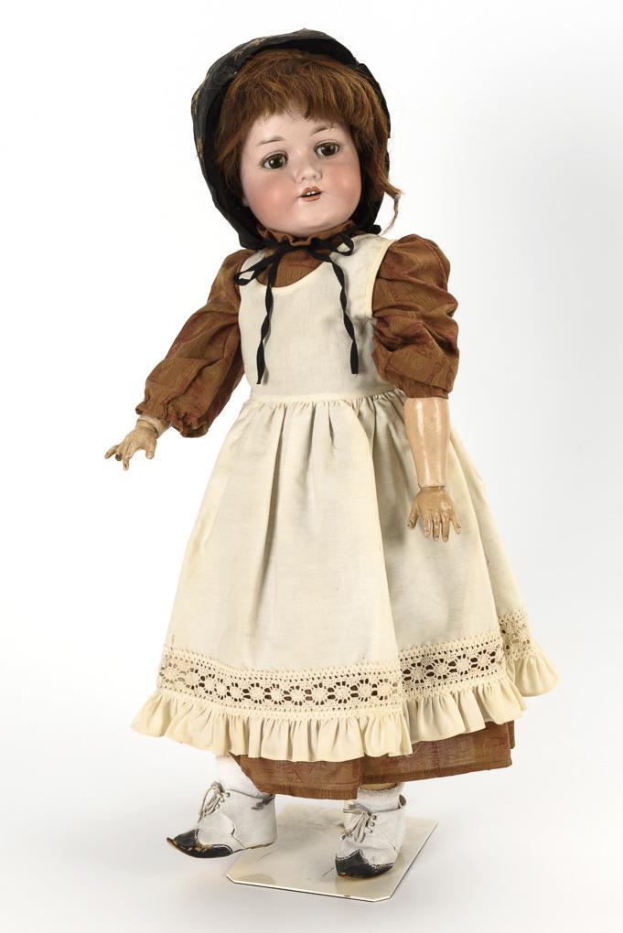 Crank head, brown sleeping eyes, eyelashes, auburn human hair wig. 15-piece limb body. Red-brown dress, white apron, black bonnet. Head x-rayed: without defects. 1 finger missing on right side.