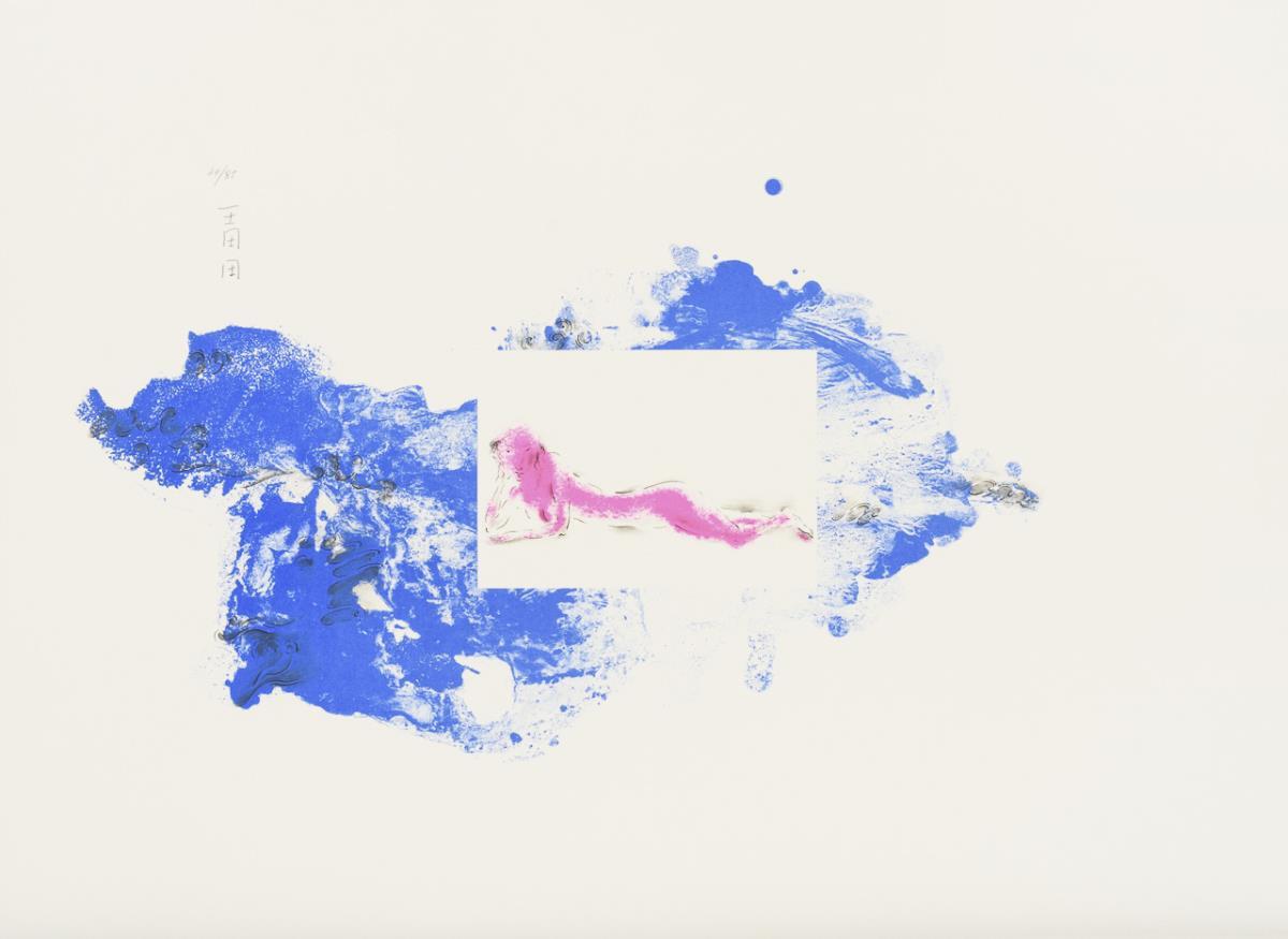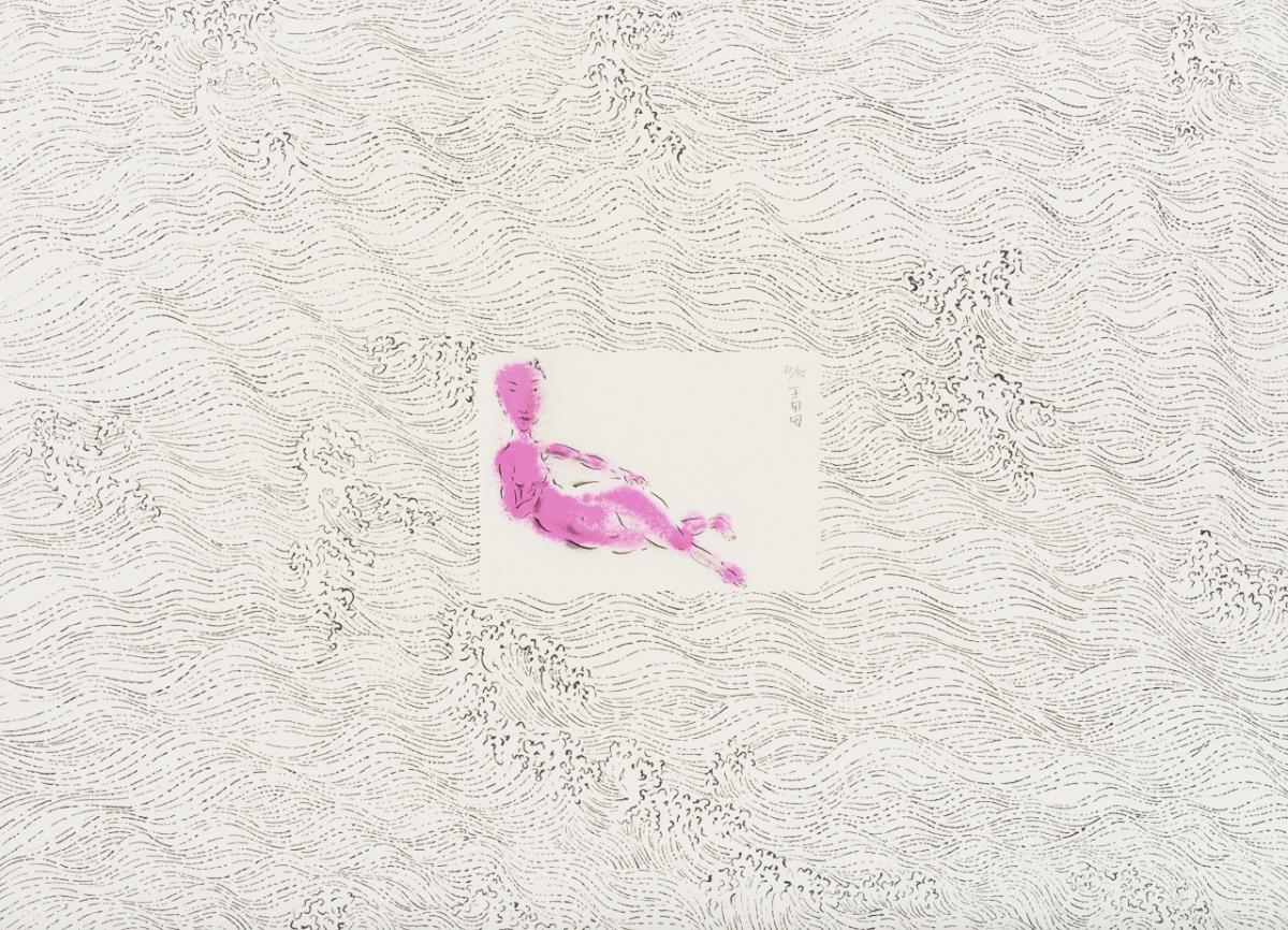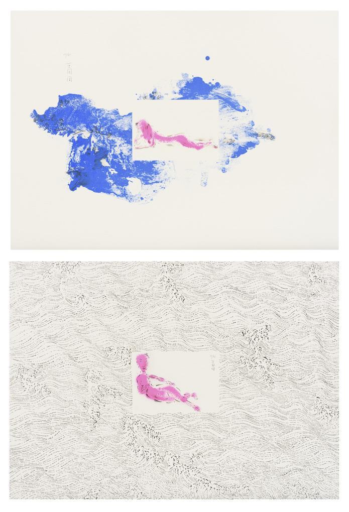 Lying female nude in pink with wavy background, copy: 75/85 | Lying female nude in pink on blue wave, copy: 44/85.
