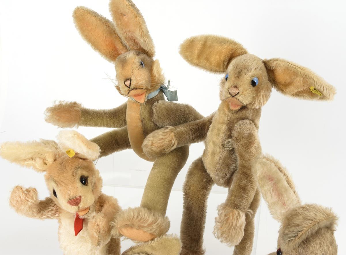 Various, standing and sitting bunnies, including 2x "Lulac". Traces of age, one eye of the sitting bunny missing.
