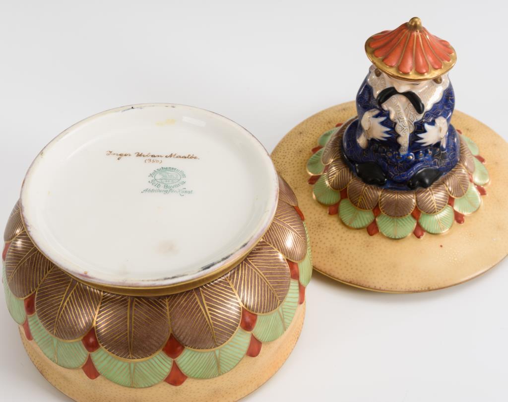 Art-déco-Dose mit Blattrelief, auf dem Deckel die Figur eines sitzenden Chinesen.