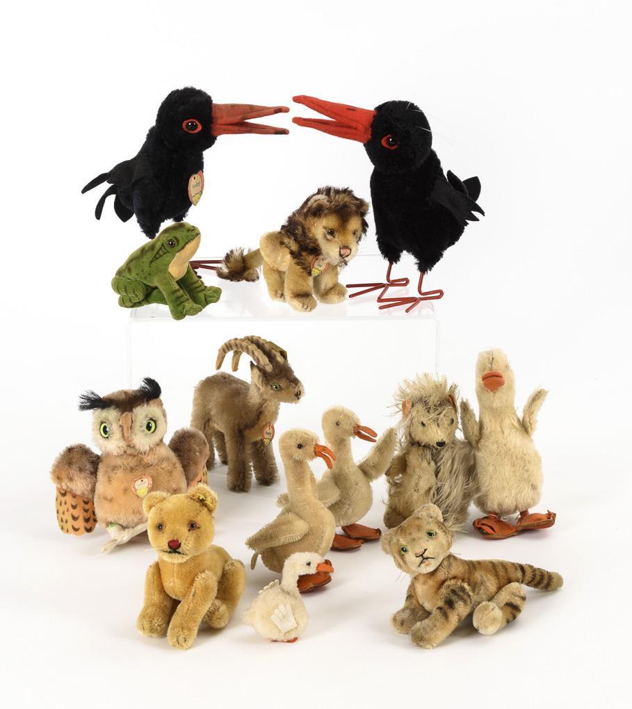 Miscellaneous animals including "Wittie", "Rocky", "Leo", "Hucky" and green velvet frog. Slight signs of age, hedgehog with small bald spots, 1 duck with defective feet.