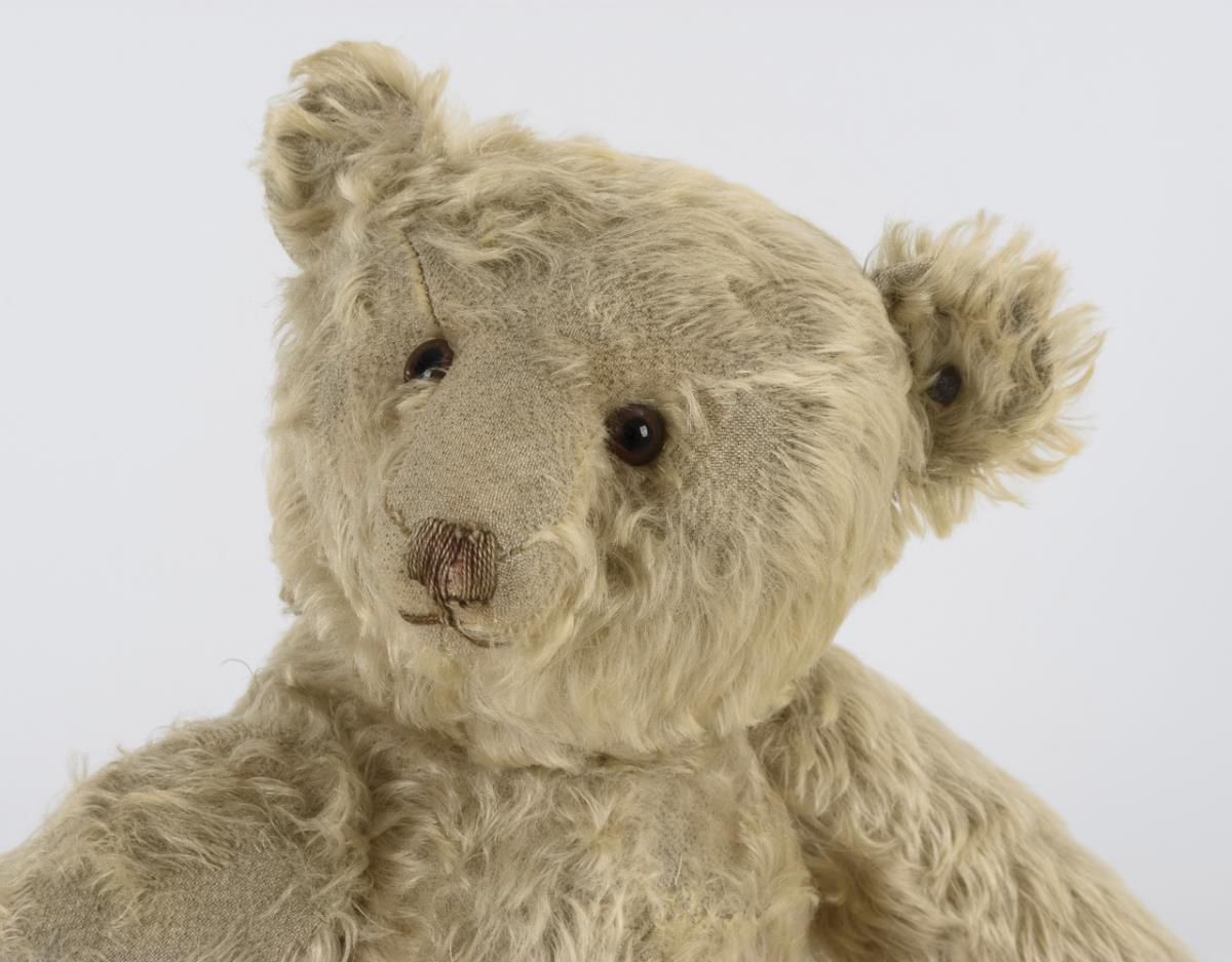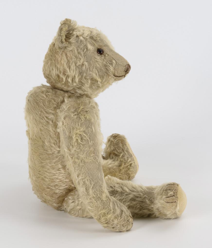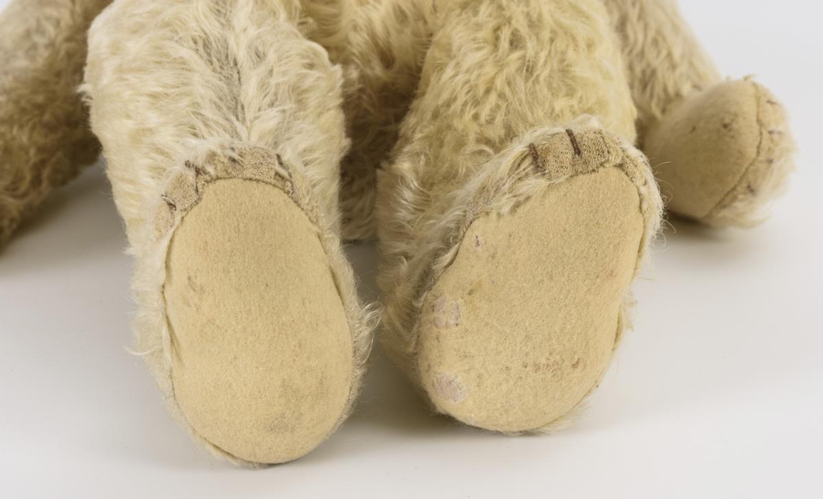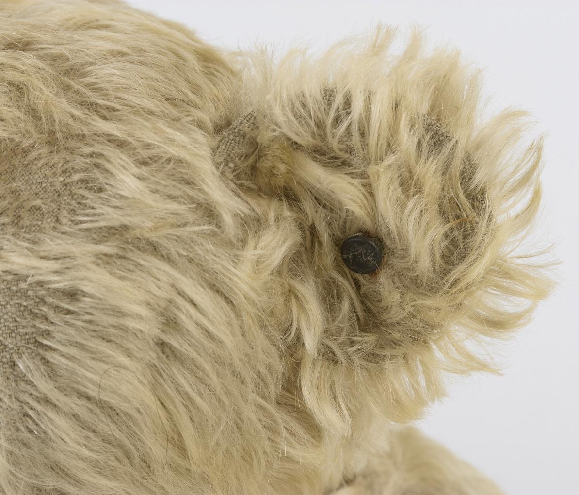 Steiff bear with turning head, hump, long arms and felt paws. Nose and right arm worn, small defects on fur and paws, voice tired.