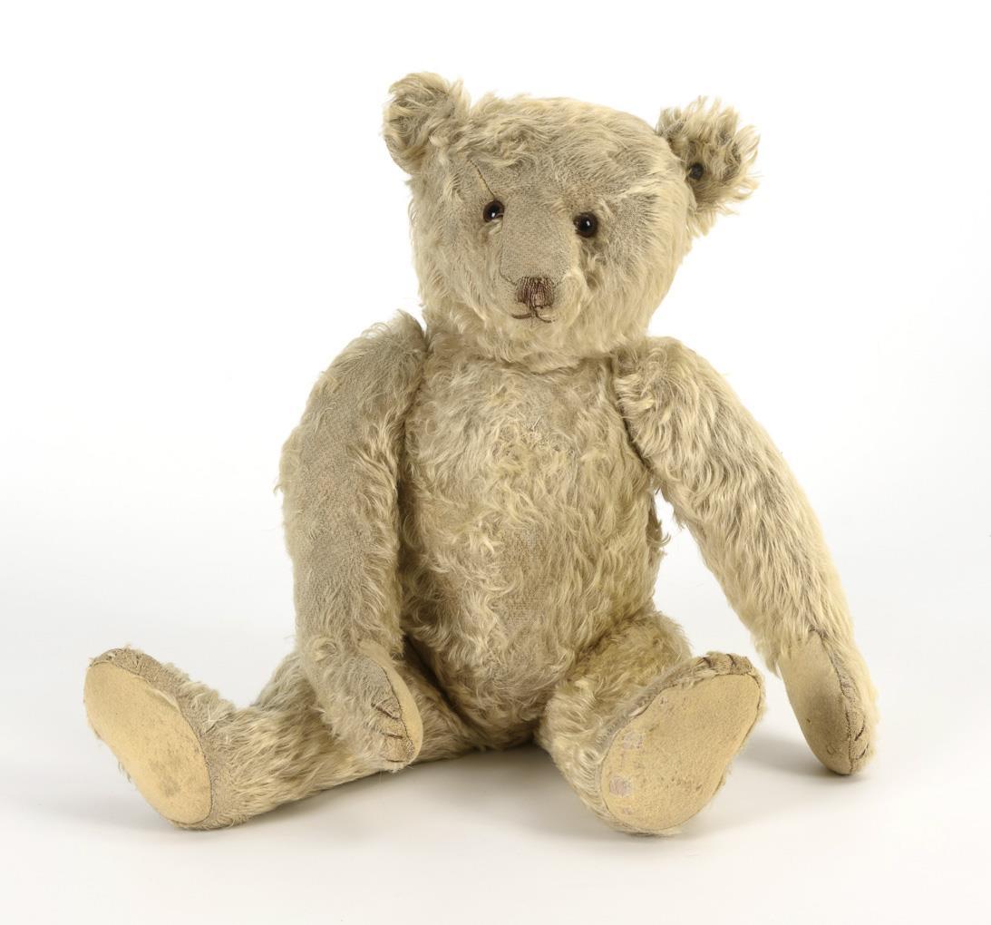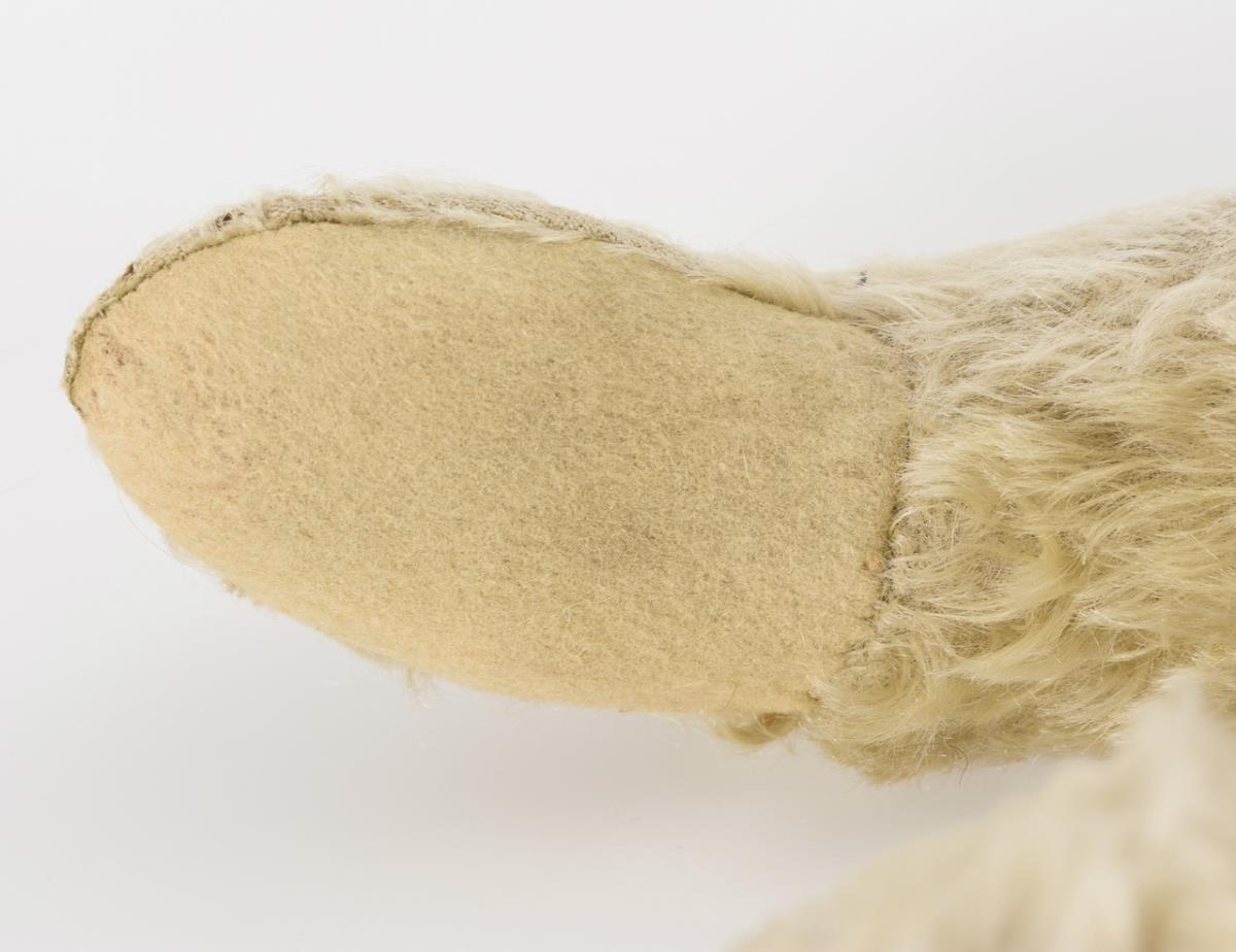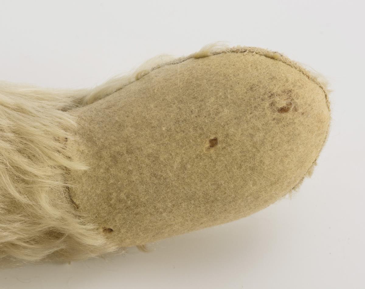 Steiff bear with turning head, hump, long arms and felt paws. Nose and right arm worn, small defects on fur and paws, voice tired.