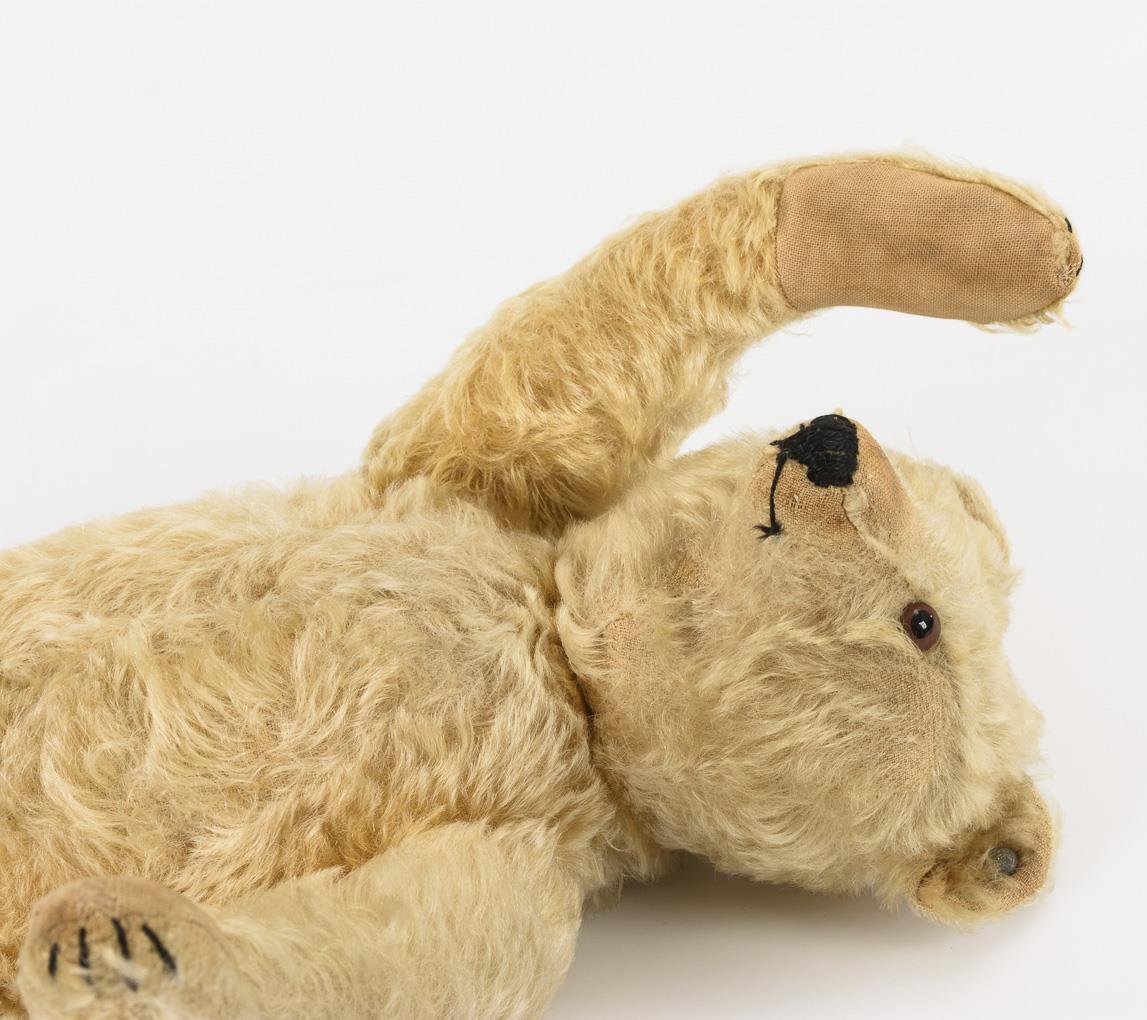 Turning head, glass eyes, black embroidered nose, original linen covers on paws and soles. Nose worn, paws and soles soiled, voice muted.