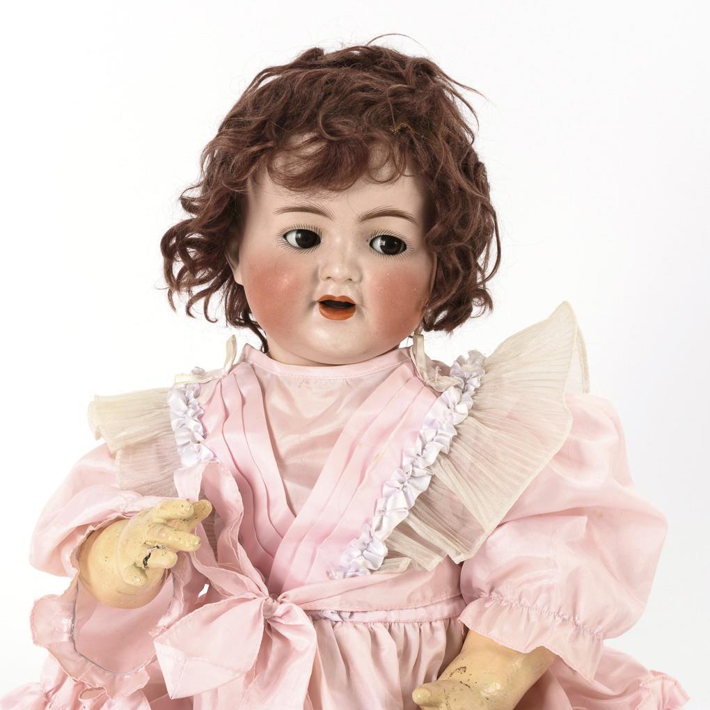 Crank head, brown sleep/shelmet eyes, auburn mohair wig. 5-piece sitting baby body. Pink dress with white lace. Head x-rayed: without defects. Body partially painted over, paint defect on belly, ring finger defective on right.