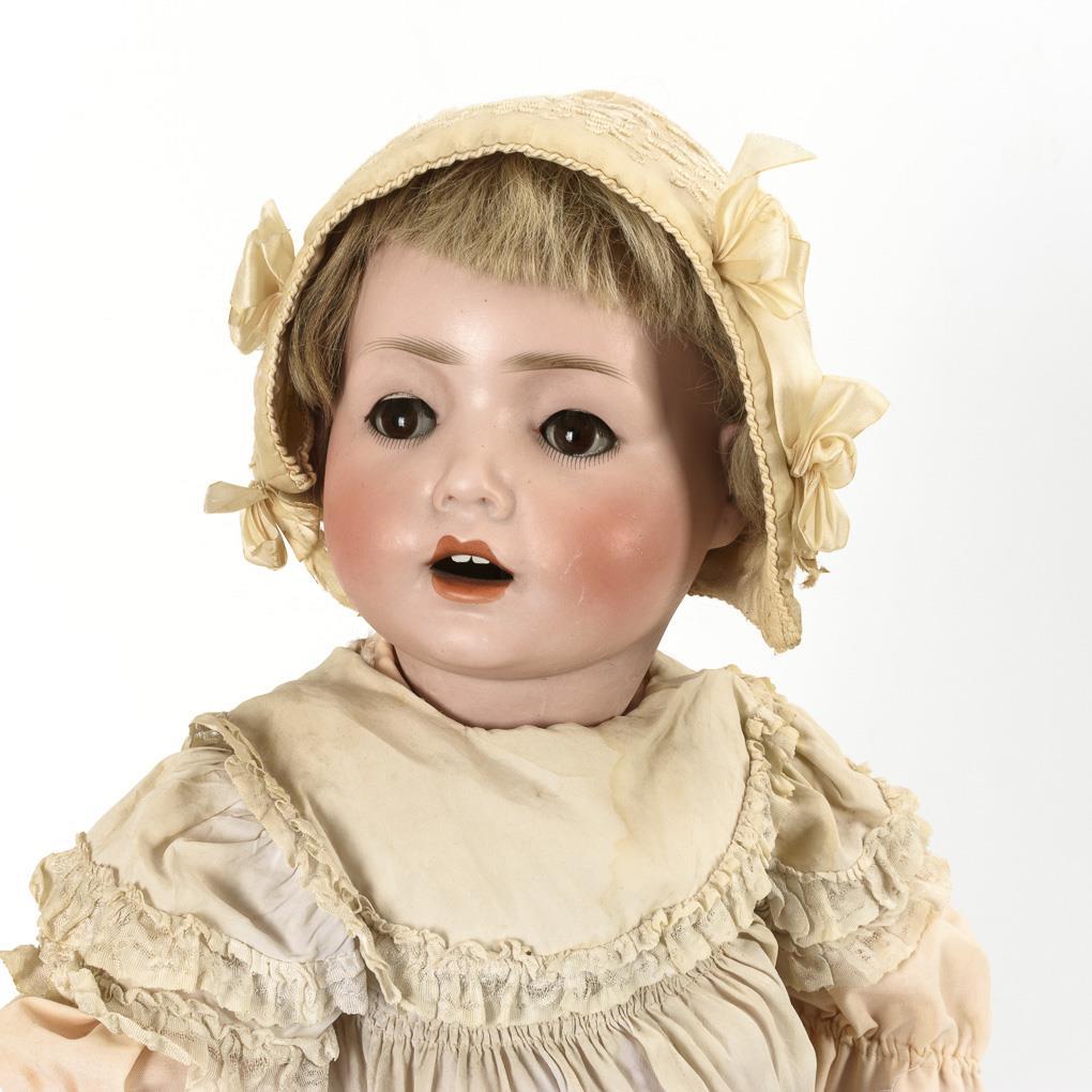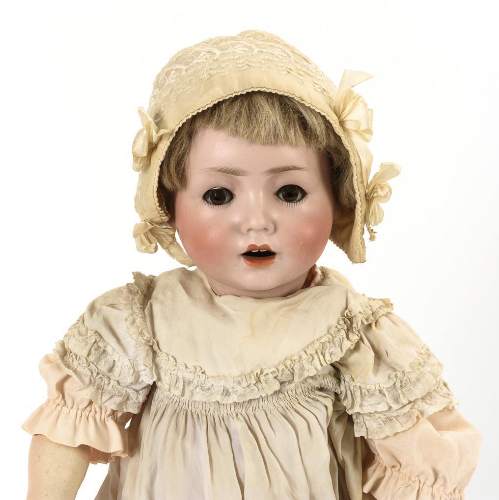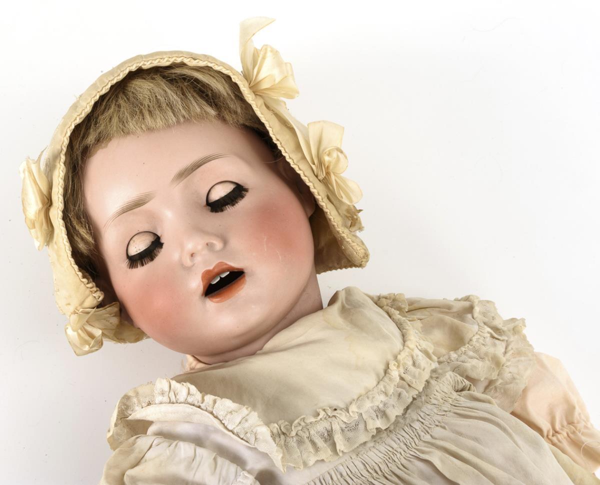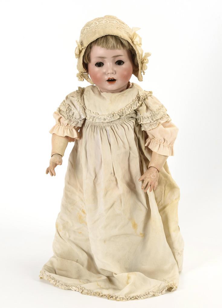 Crank head of fine bisque, brown sleeping eyes, eyelashes, blond human hair wig. 19-piece toddler body. Long white dress, embroidered bonnet, brown children's shoes. Head x-rayed: without cracks, only small chip at the crown of the head, cheek little rubbed. Fingers partly repaired.