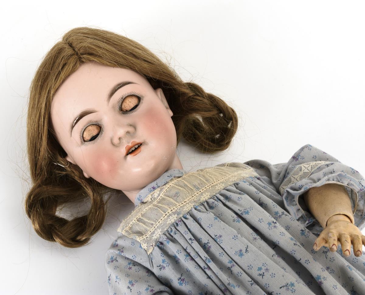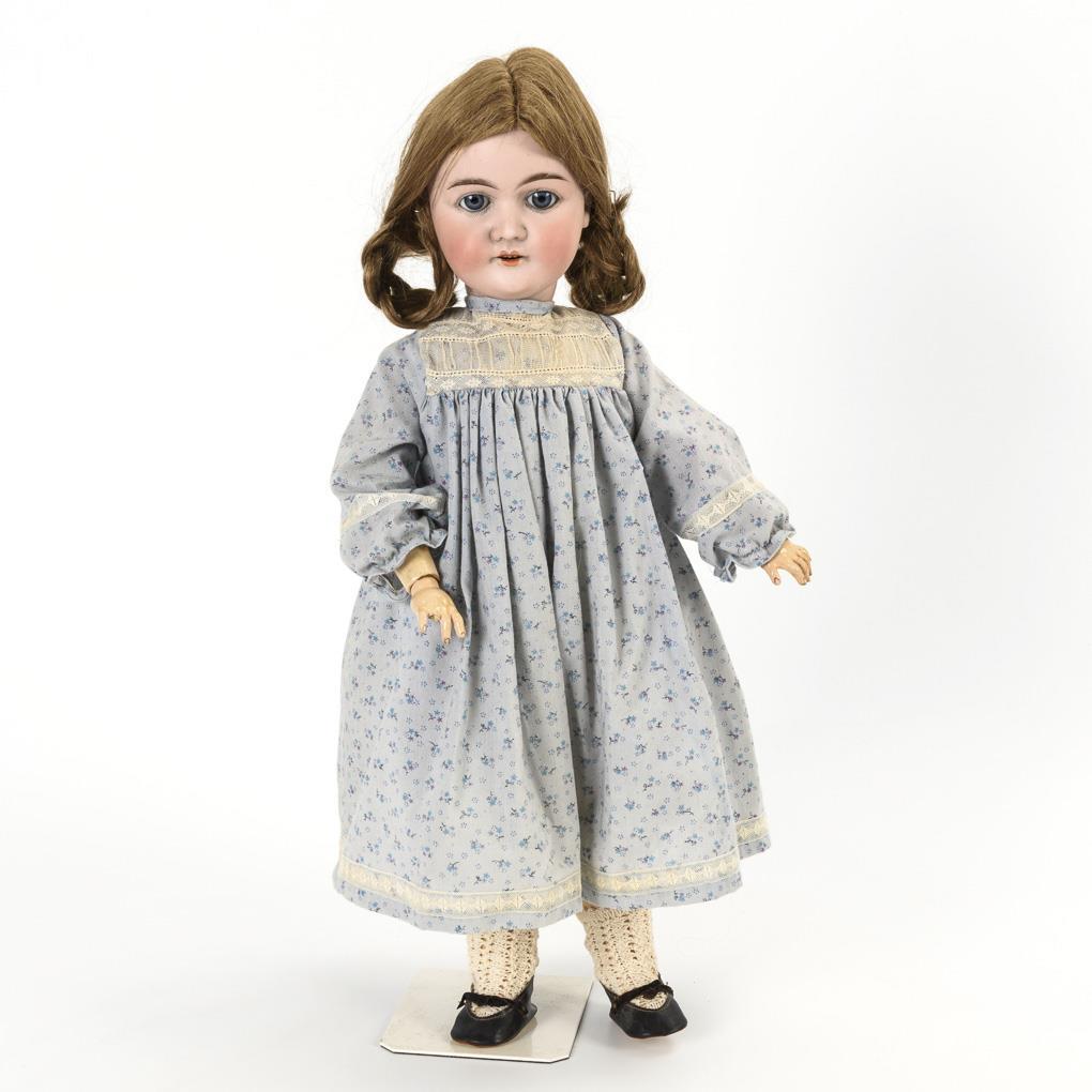 Crank head, blue sleep eyes, medium blonde human hair wig. 15-piece limb body. Light blue flowered dress, black shoes. Head x-rayed: without defects. Body slightly too small, 1 finger missing on the right.