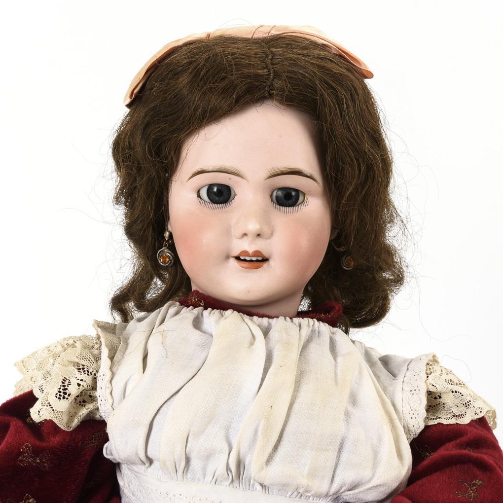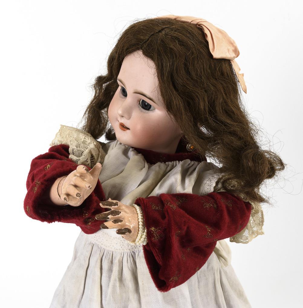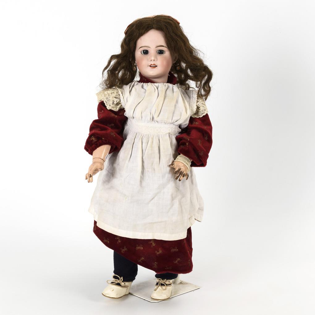 Crank head, blue sleep eyes, pierced ears, brown curly wig with pink bow. 11-piece limb body with 2-piece torso and intact voice (with 2 drawstrings). Red velvet dress, white apron, white shoes. Hair tear from left temple to cheek, hands with paint defects.