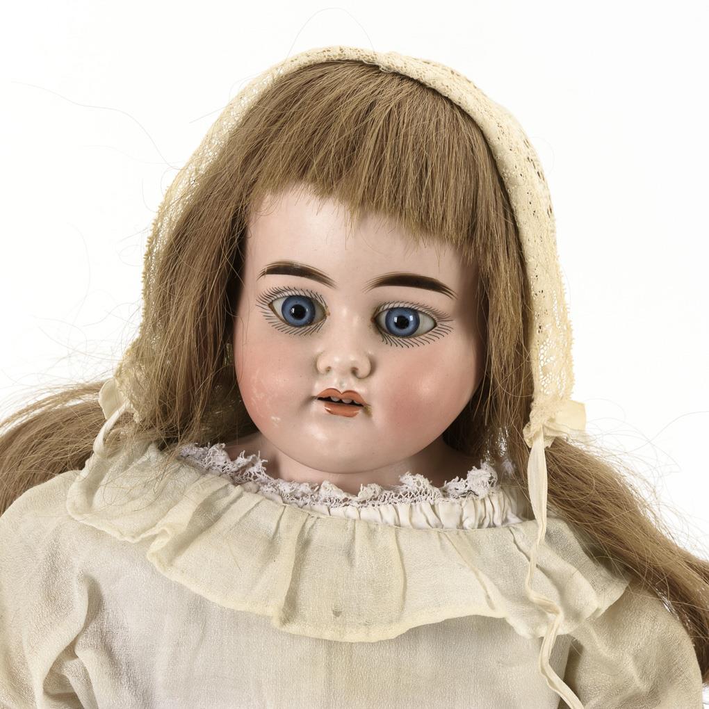 Chest head, solid blue eyes, younger complemented blond human hair wig. Fabric body with forearms made of mass. White dress, lace hood, brown leather shoes. Head x-rayed: without cracks, only small chip on the crown of the head. Body spotted, with repair spots, right arm remodeled.