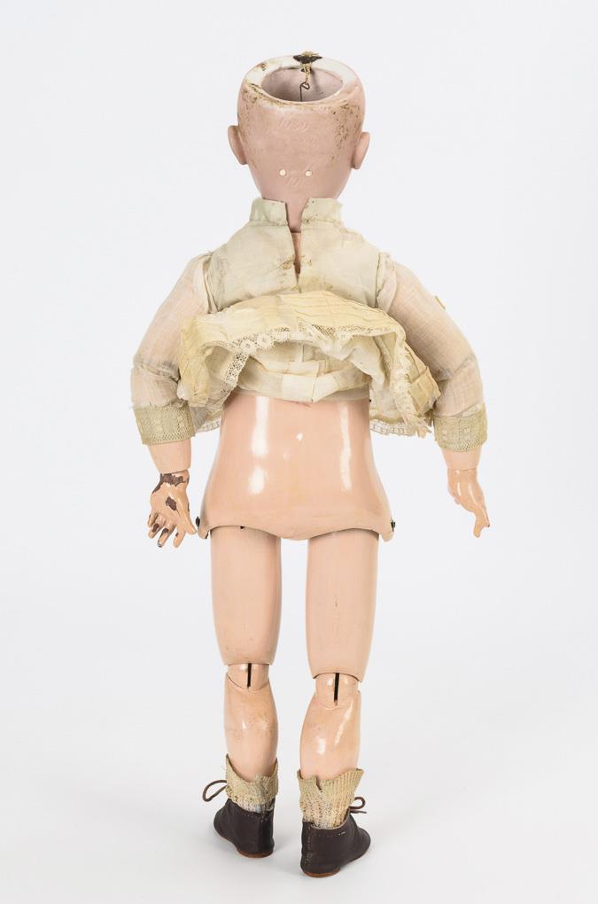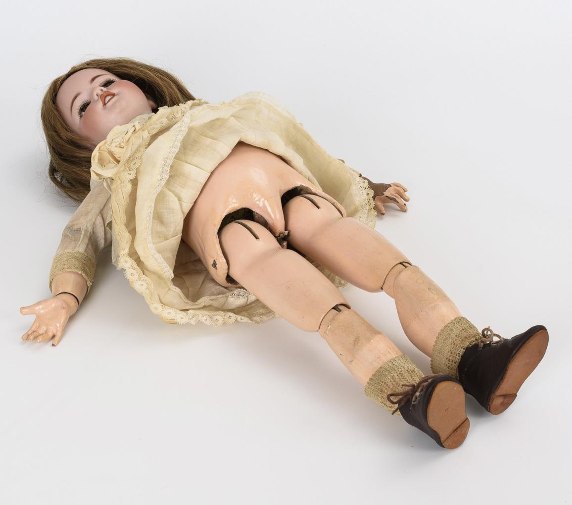 Crank head, sleeping/shell eyes with real hair eyelashes, long real hair wig, ear holes. 11-piece barrel body with head/leg mechanism and 2-piece torso. Old white dress, younger brown leather shoes. Head x-rayed: without defects, at the forehead minimal wig pull. Hands with heavy paint defects.