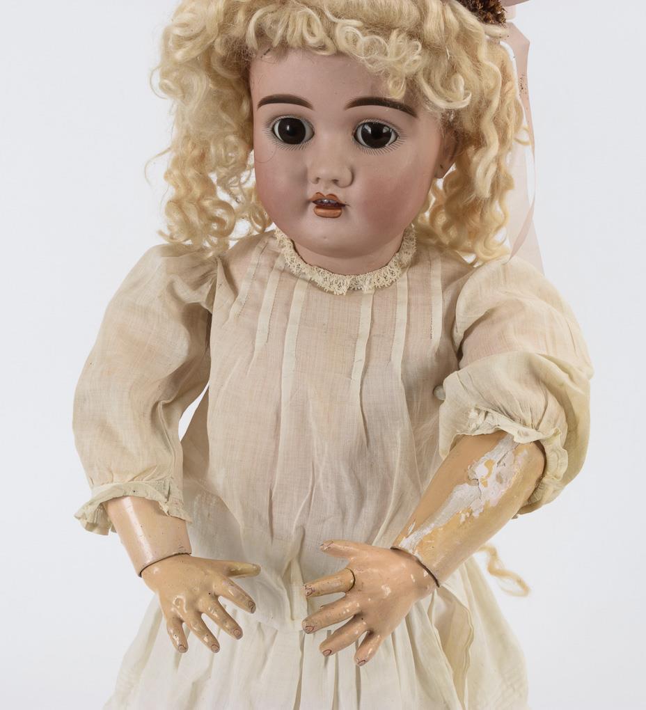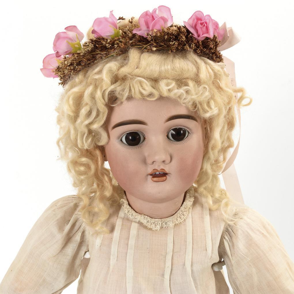 Defective crank head, brown sleep eyes, pierced ears, blonde curly mohair wig. 17-piece link body with red company stamp. White dress, flower wreath in hair, black shoes. breakout at neck crank. Wig with defects. Body with small defects and paint chips, 1 finger glued.