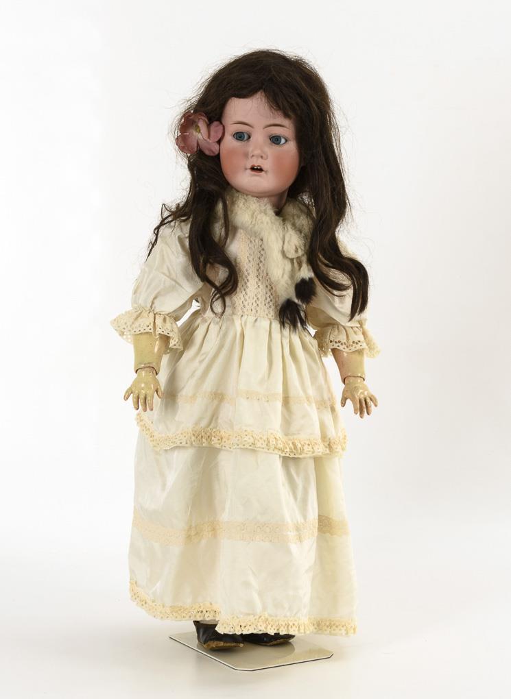 Crank head, blue sleep/shelmet eyes, brown long hair wig. 17-piece limb body. White dress, ermine collar, old black oilcloth shoes. Head x-rayed: without defects. Body partially painted over, toenails painted.