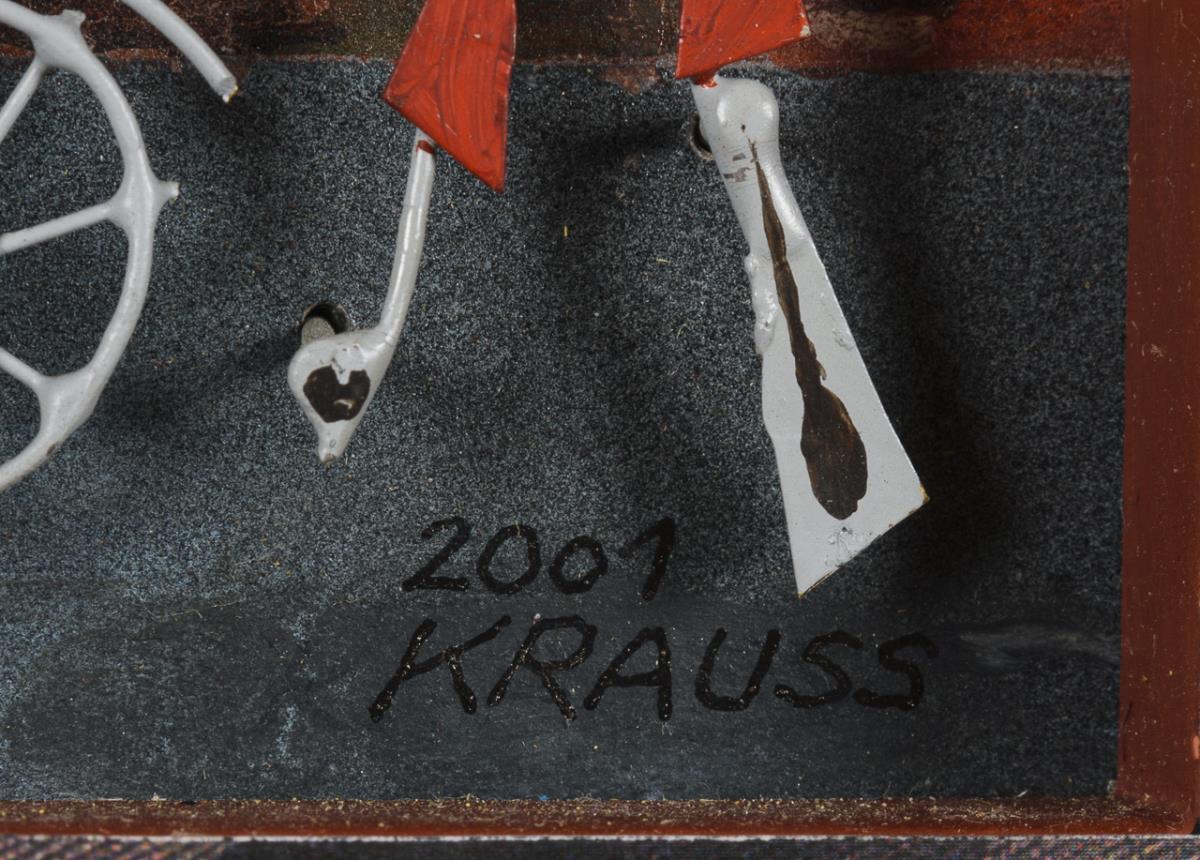 Mixed media with figurative metal applications. Signed lower right, signed/titled on verso. Dated: 2001.