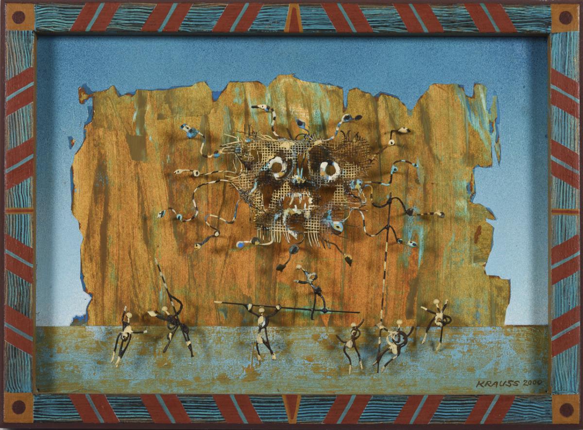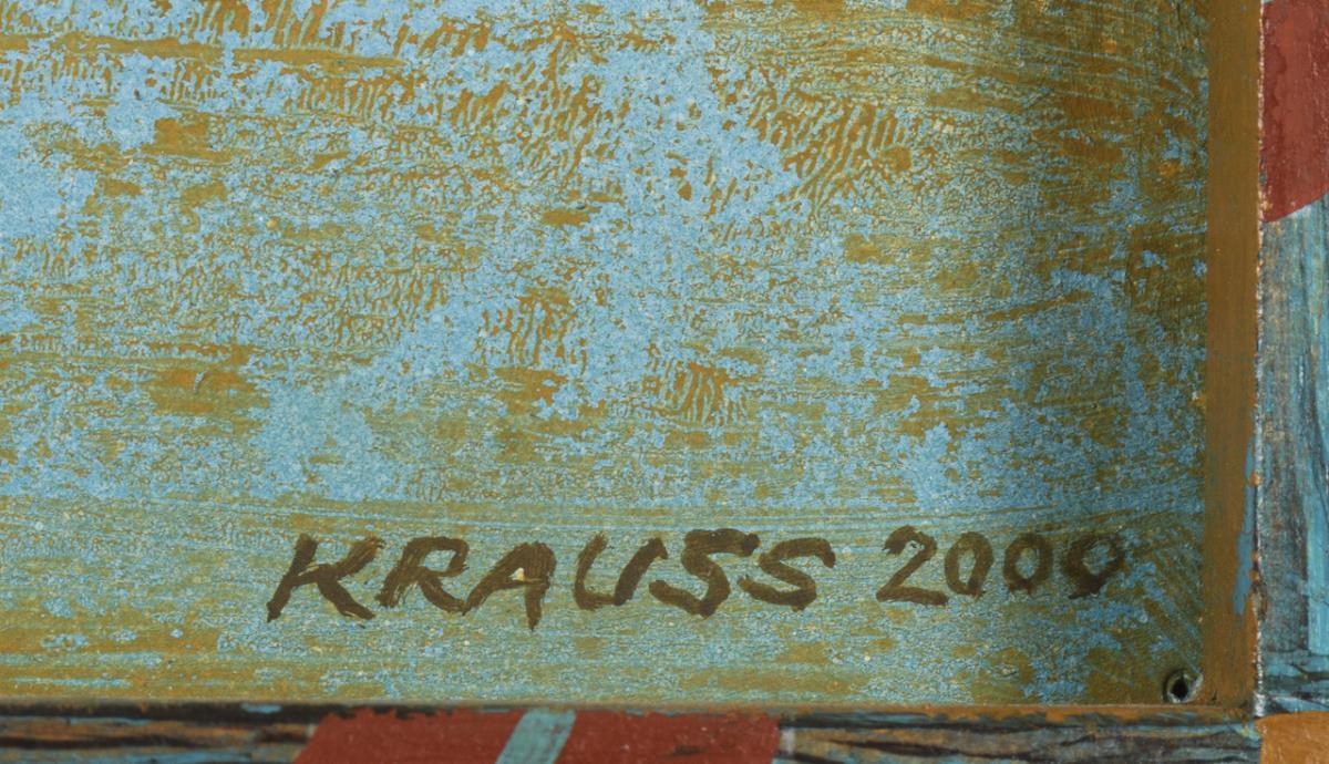 Mixed media with figurative metal applications. Signed lower right, titled on verso. Dated: 2000.