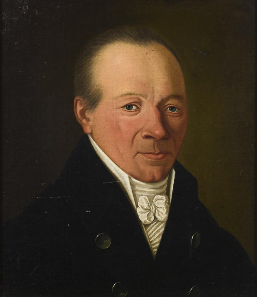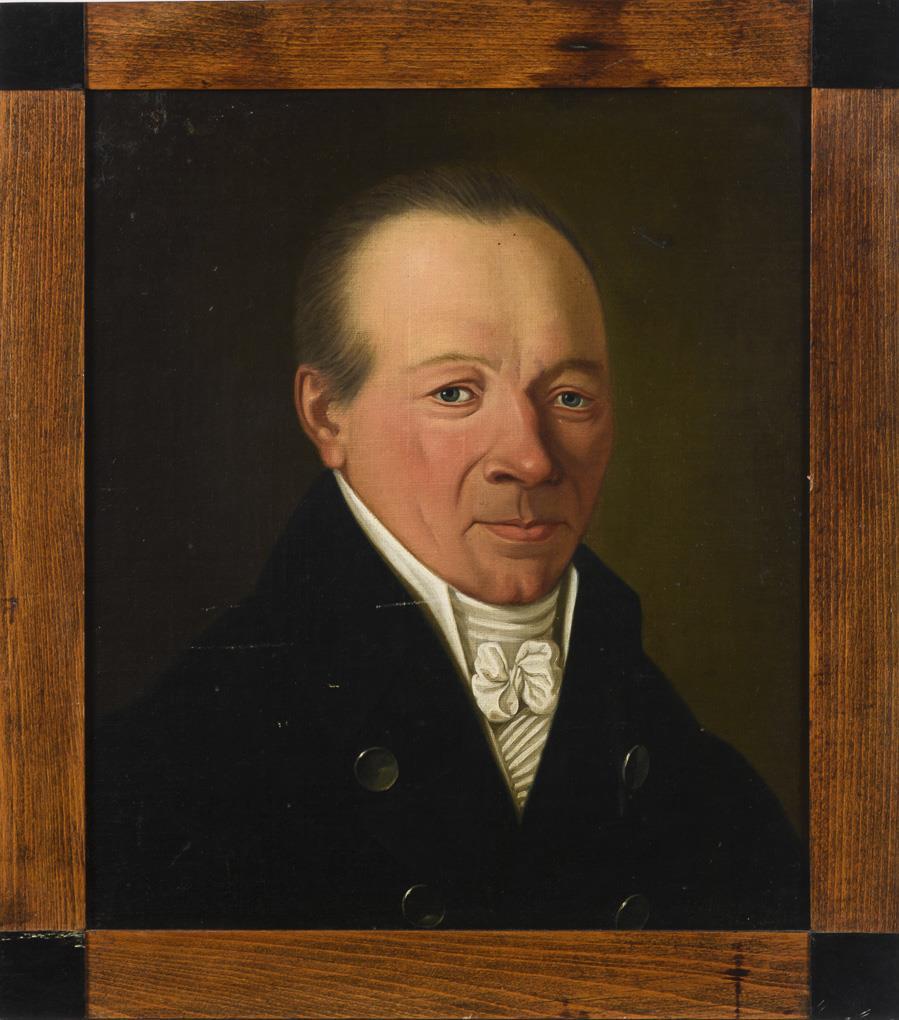 Portrait of a man in a dark frock coat with white neckerchief and shirt. Traces of age.