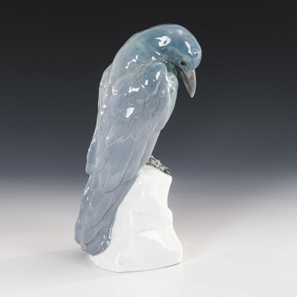 Sitting on a stone base, looking to the ground raven.