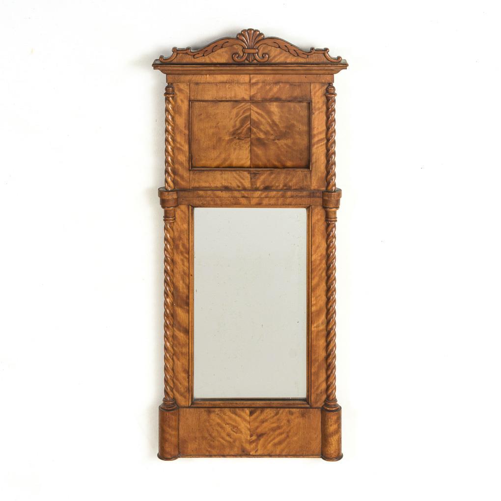 Elegant wall mirror with small cornice and curved palmette crowning, flanked by twisted columns, decorated with mirror veneer. Traces of age/use, mirror glass with small spots.