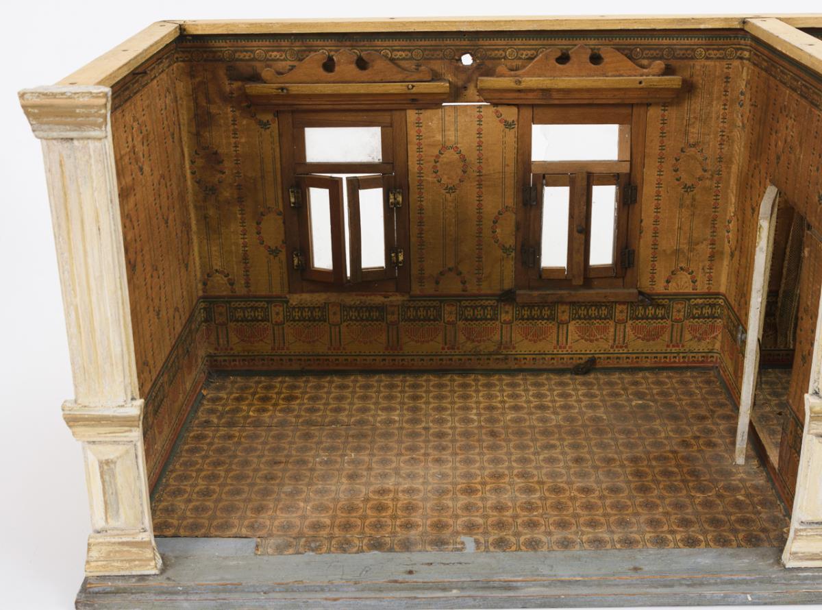 Empty 2-room case with 3 windows, a curtain and intermediate door. Original Art Nouveau wallpaper and parquet-look floor paper. Signs of age, 1 skylight defective, 2 casements missing.